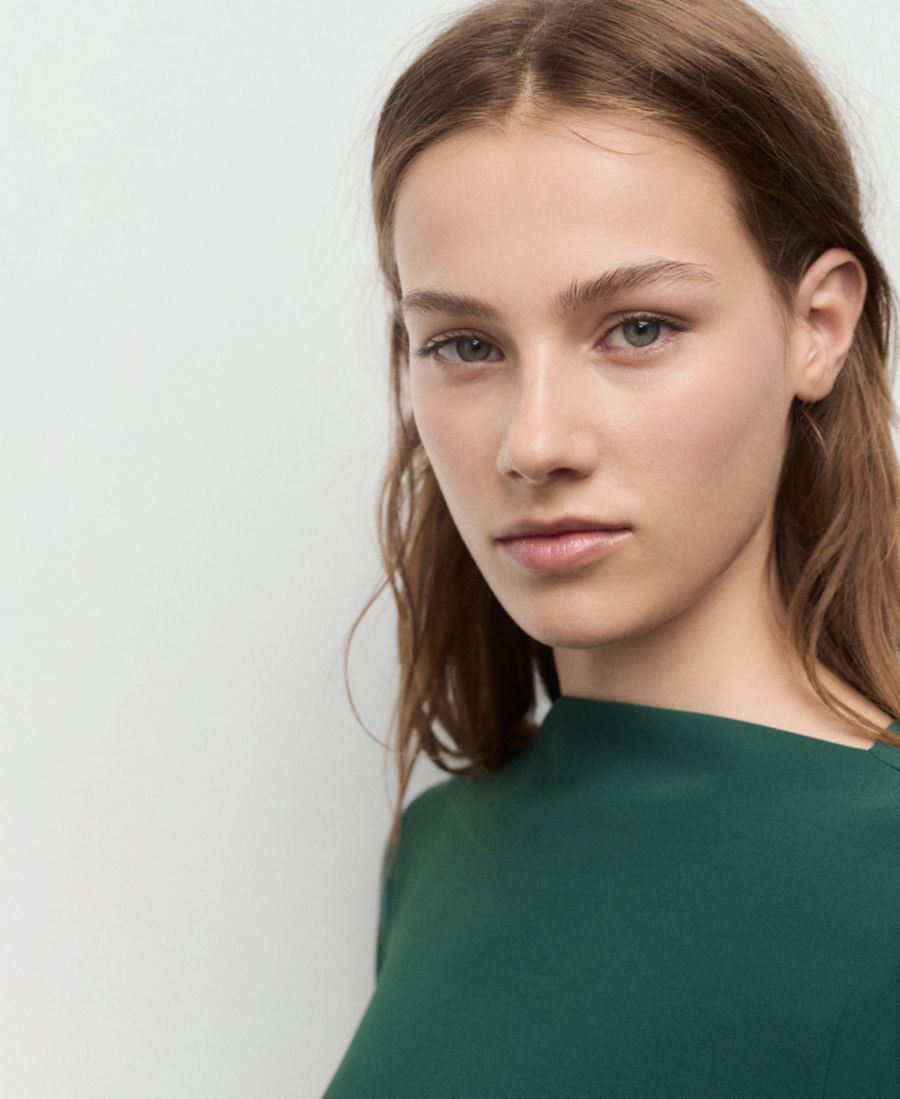 Платье Mango с вырезом-лодочкой и сборками отличается гладким, чистым кроем. Это короткое платье имеет вырез-лодочку, длинные рукава и боковые складки.