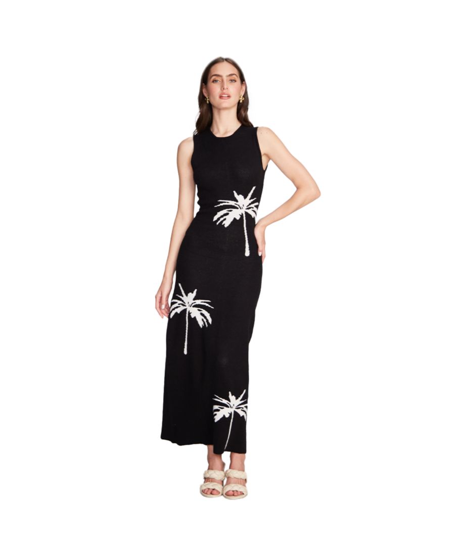 Черное длинное платье с пальмами: это облегающее черное длинное платье с белыми деталями в виде пальм идеально подходит для стильного летнего образа.