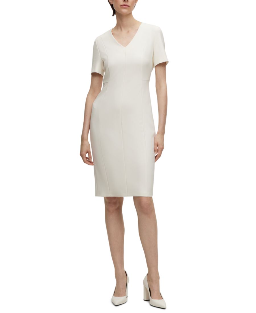 Деловое платье приталенного силуэта от BOSS Womenswear. Эта модель с короткими рукавами выполнена из эластичной ткани и имеет V-образный вырез.