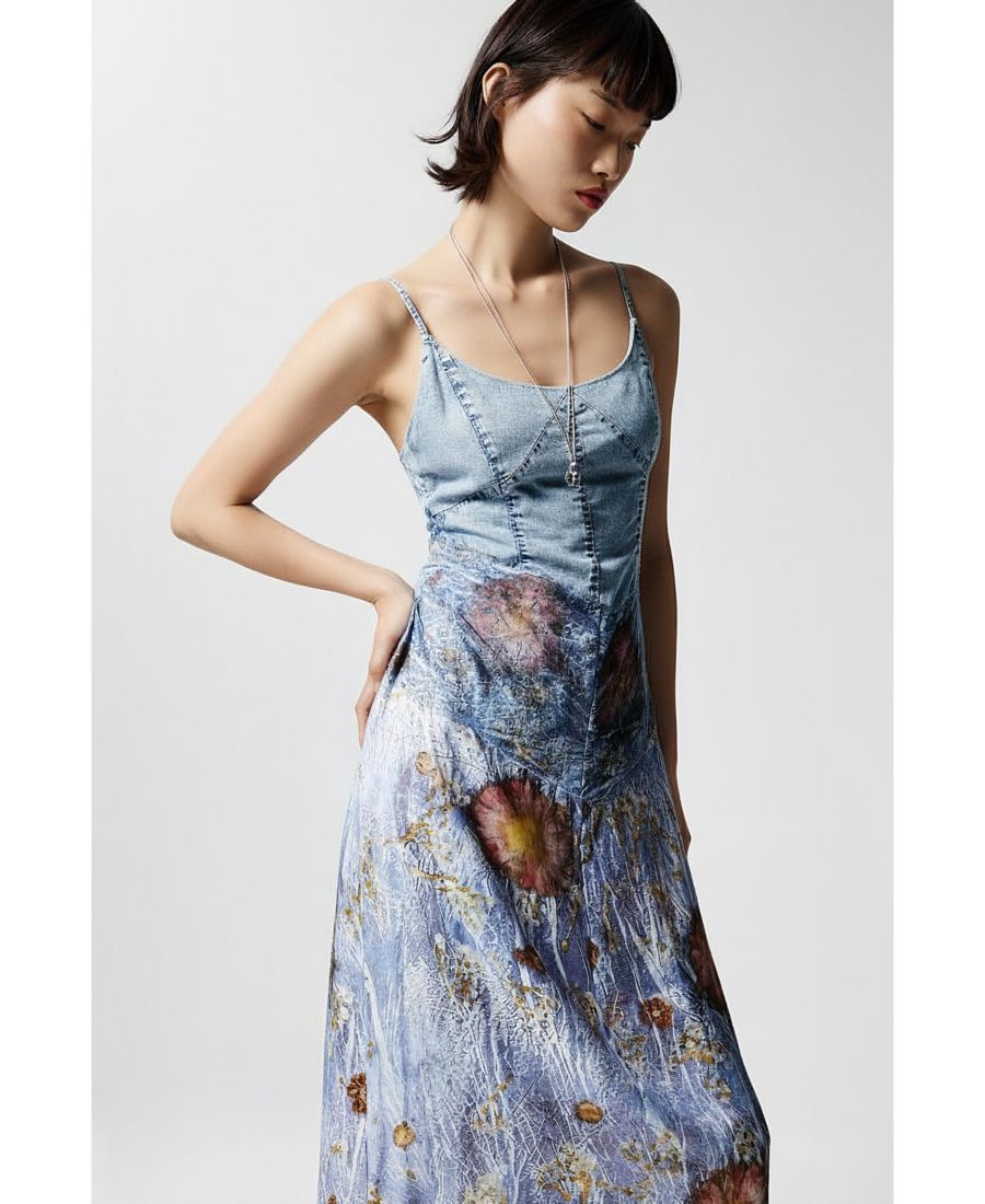 Платье из двух материалов с бретелями, выполненное из комбинированных тканей: верх из денима, юбка из струящейся ткани с кружевной отделкой.