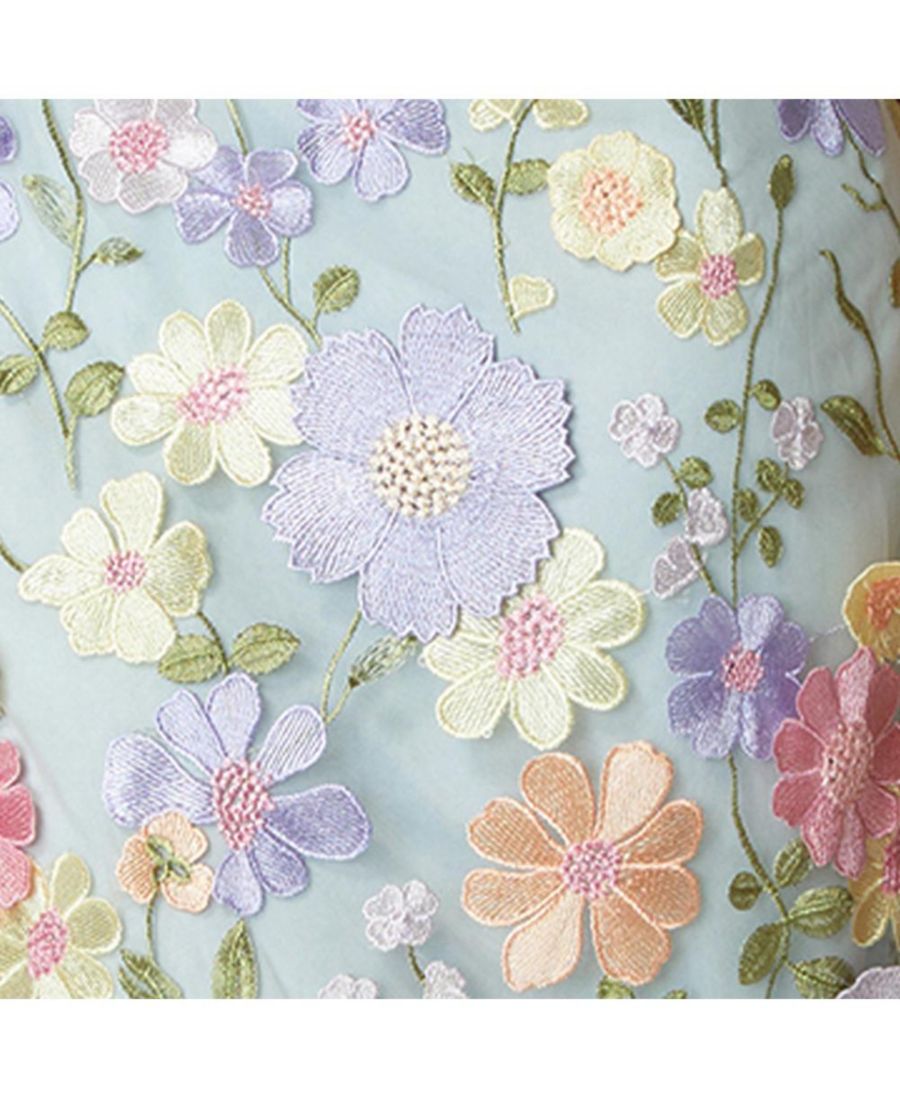 Замысловатая цветочная вышивка, тщательно выполненная вручную на лифе и юбке, добавляет нотку игривости и очарования.