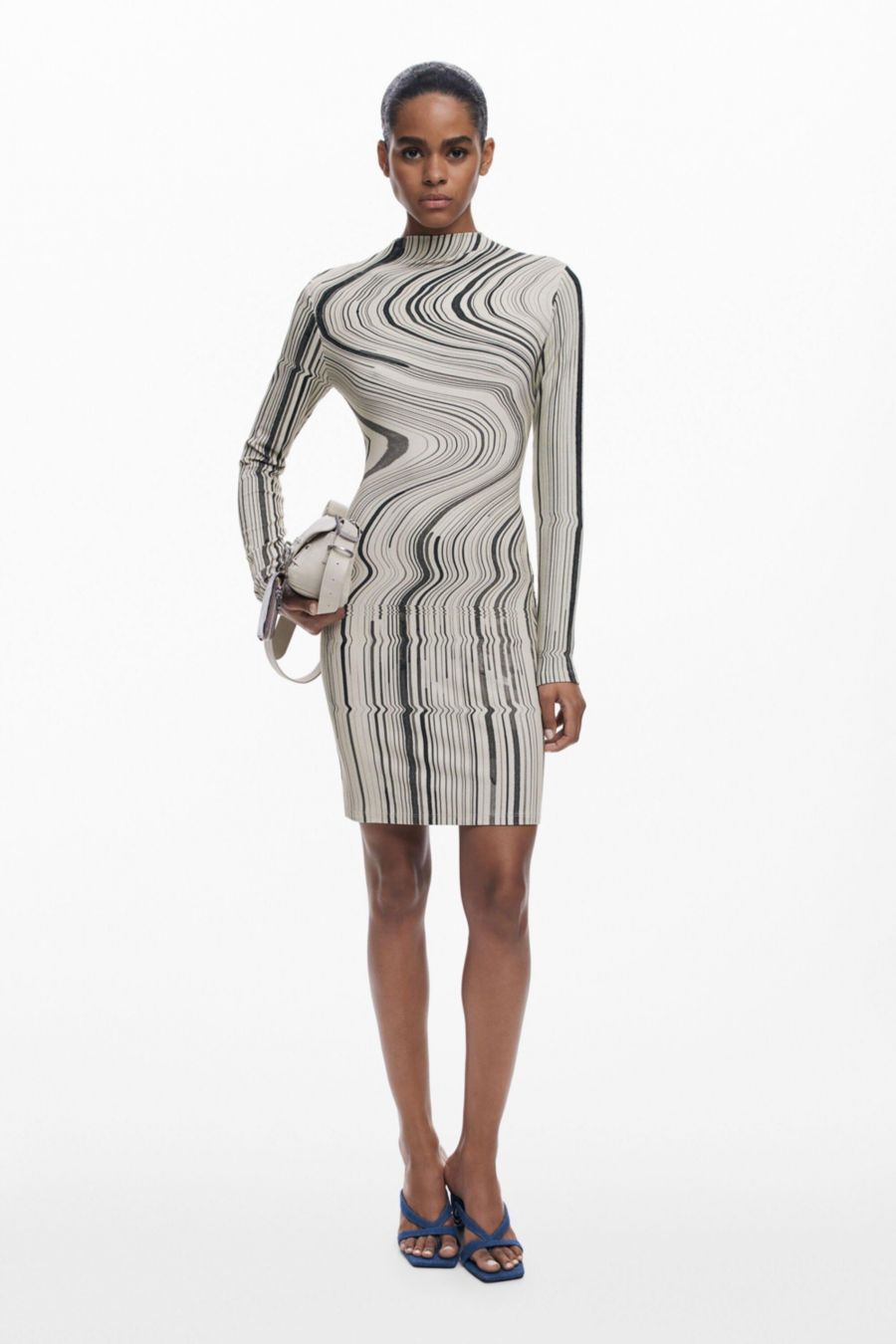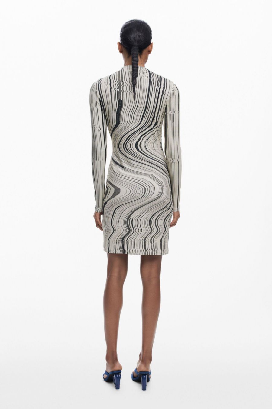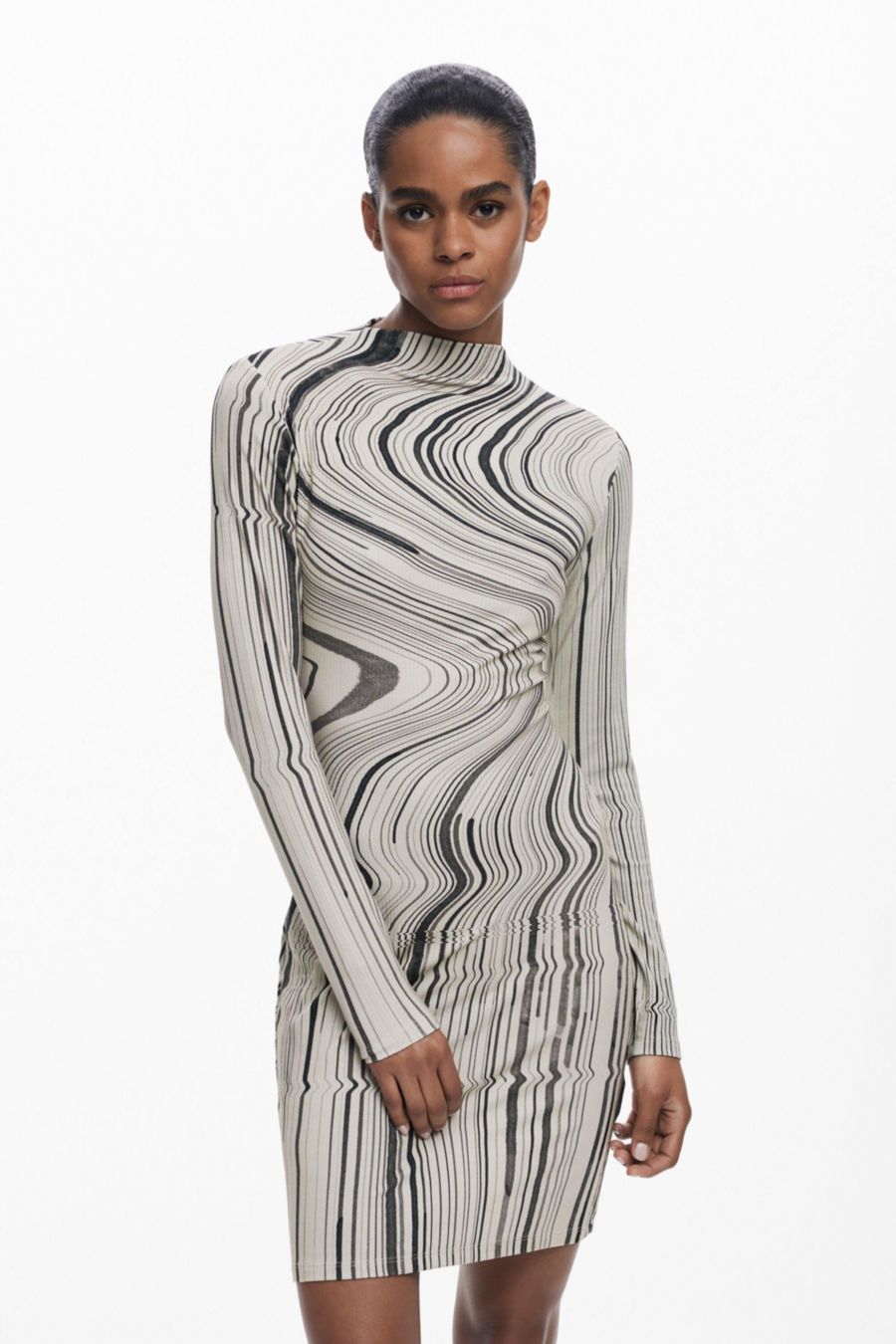 Короткое облегающее трикотажное платье с длинными рукавами и круглым вырезом, украшенное волнистым полосатым принтом.