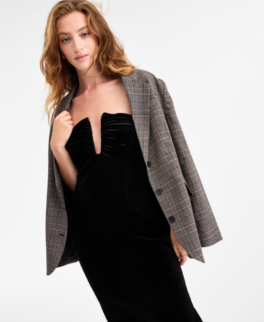 Элегантный, роскошный бархат придает этому облегающему платью без бретелей от Bar III прекрасную текстуру.