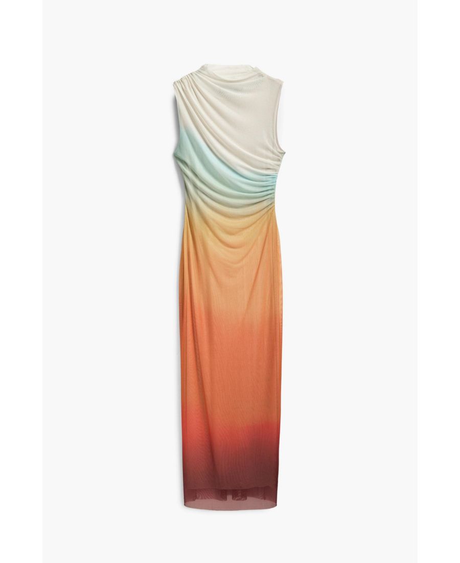 Платье миди из тюля, без рукавов, с круглым вырезом и драпировкой спереди, с градиентным переходом цвета.