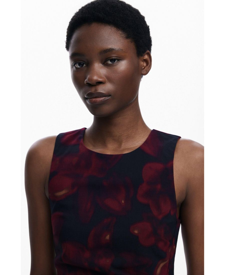 Короткое платье-сарафан без рукавов, с круглым вырезом, присборенным спереди и цветочным принтом.
