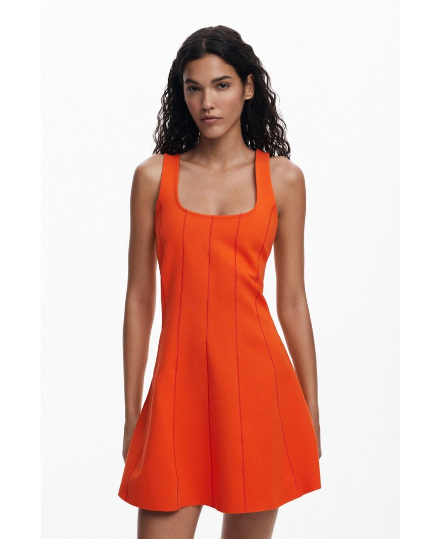Короткое облегающее платье с вертикальными вставками, квадратным вырезом и однотонными бретелями.