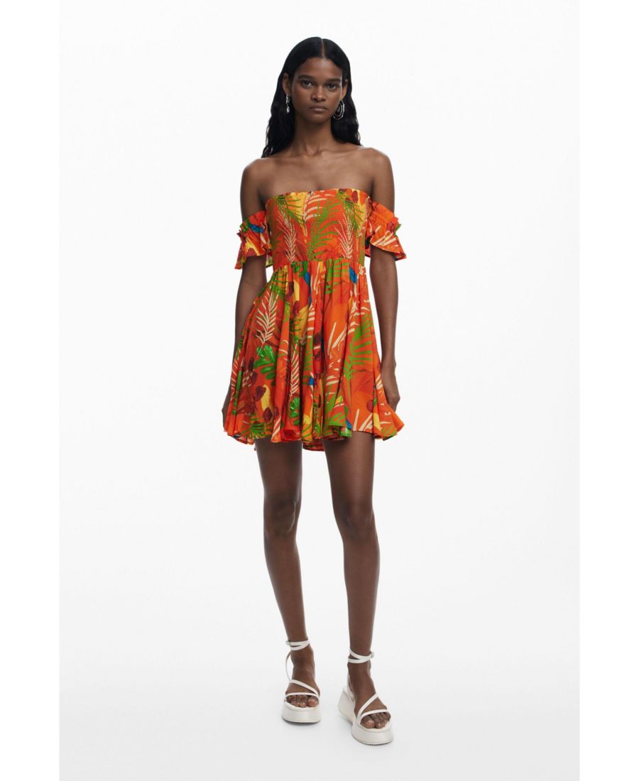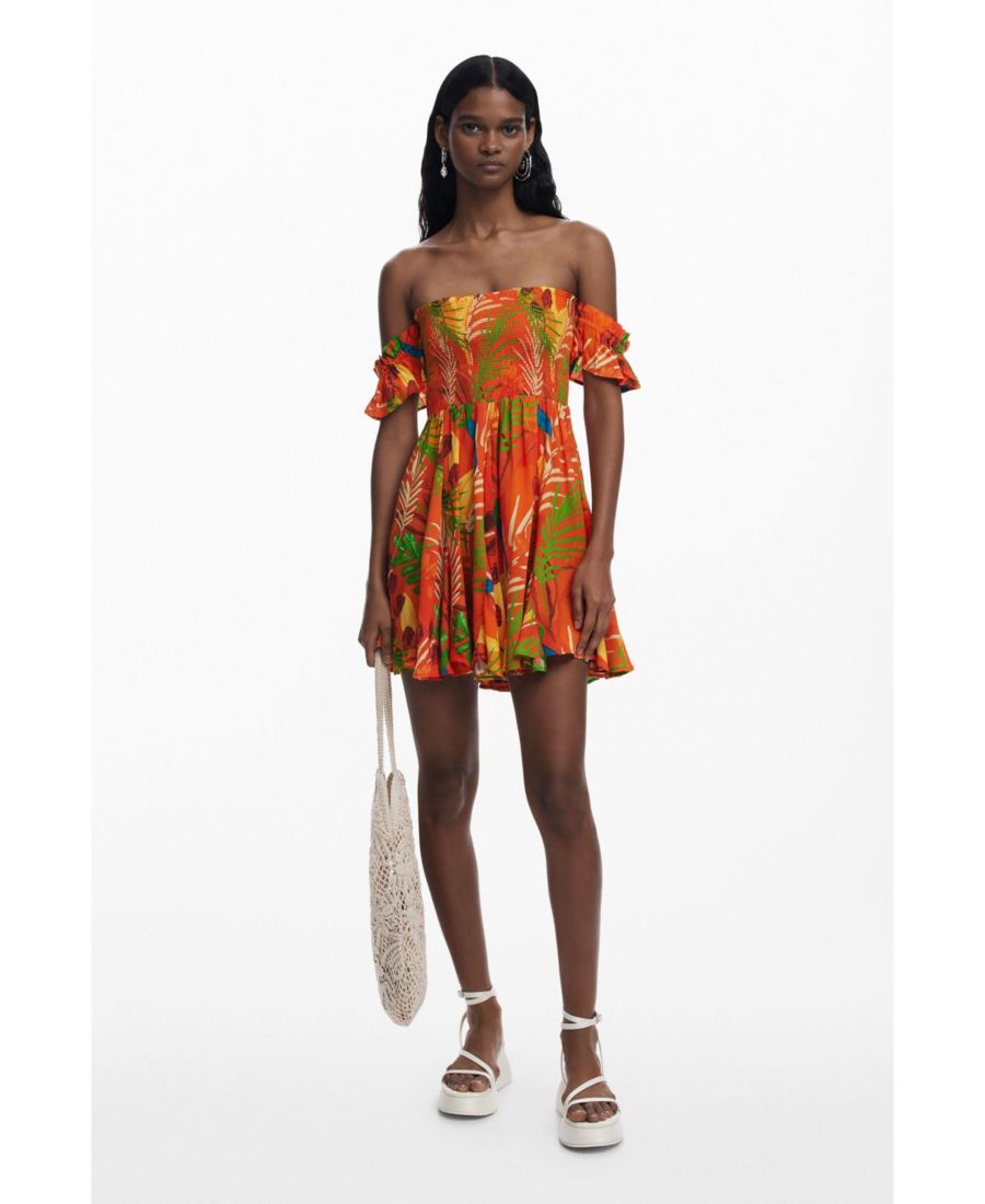 Короткое платье с открытыми плечами, эластичным верхом и расклешенной юбкой, тропический принт.