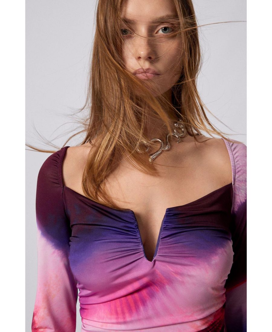 Платье с длинными рукавами, миди-крой, вырез сердечко, разрез по низу и градиентный принт.