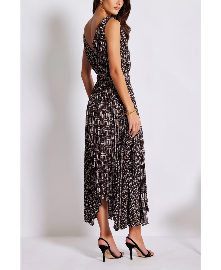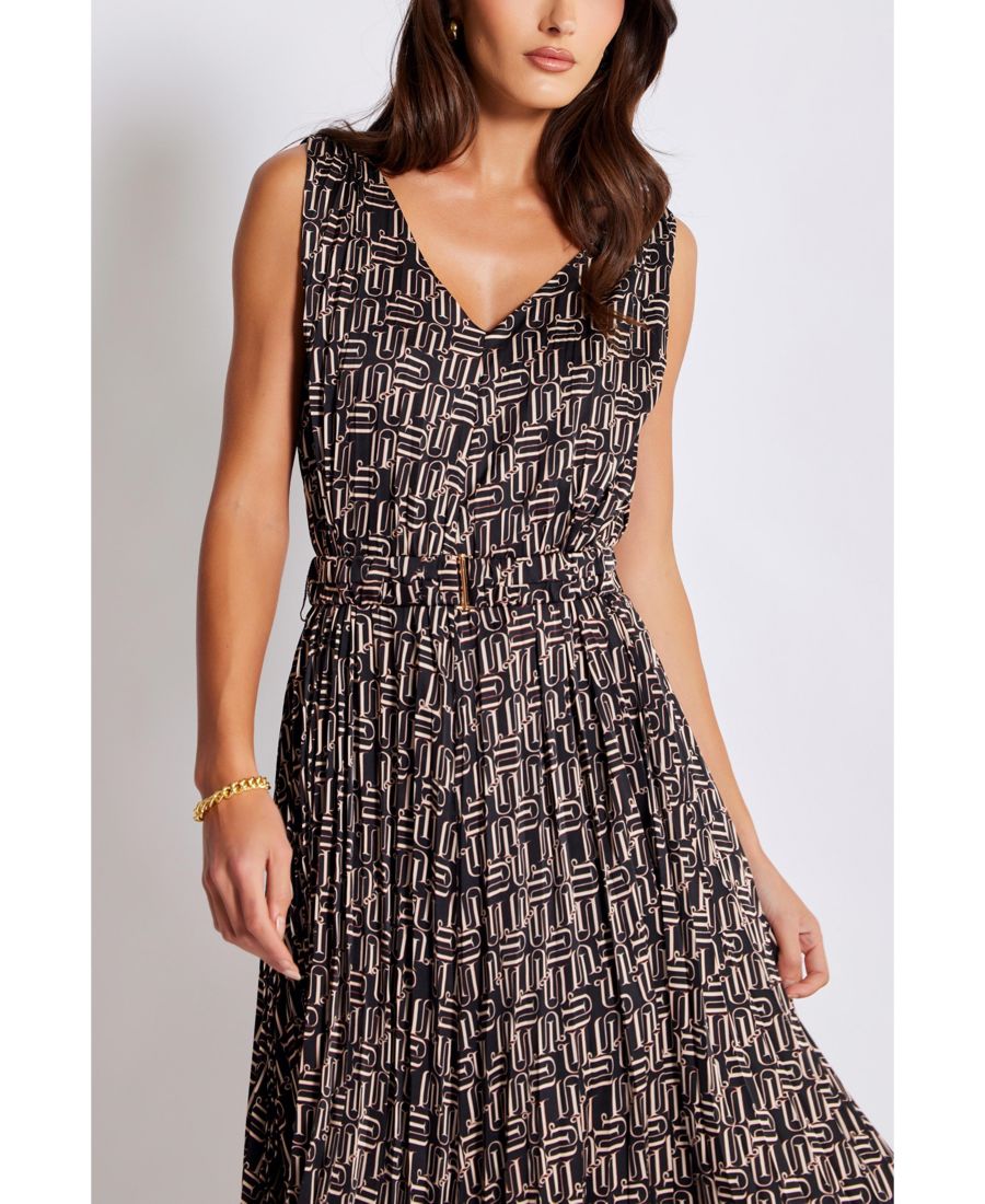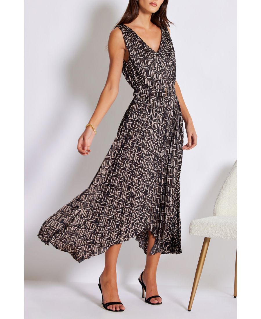 Плиссированное платье с асимметричным подолом и поясом из той же ткани с золотой пряжкой.