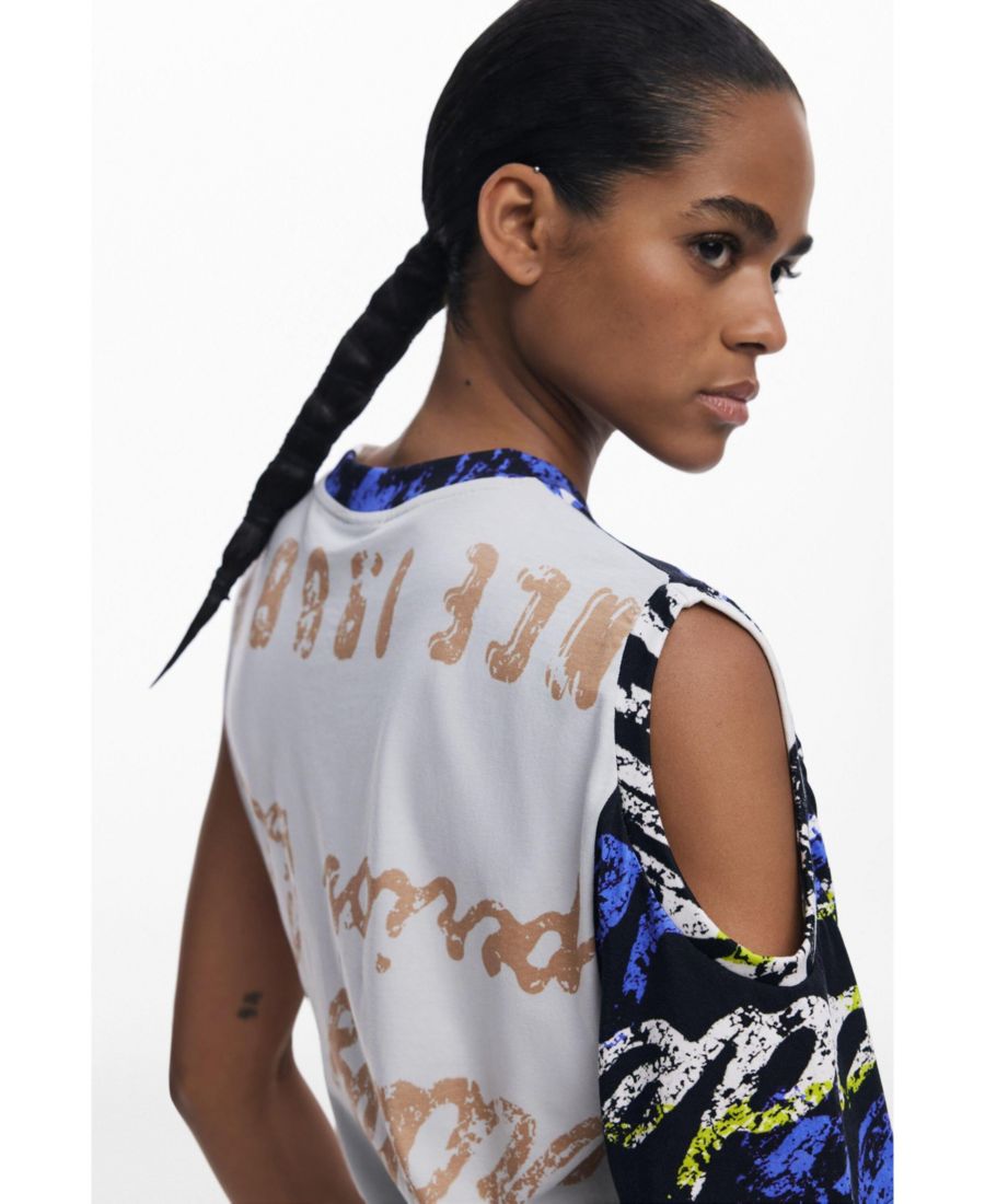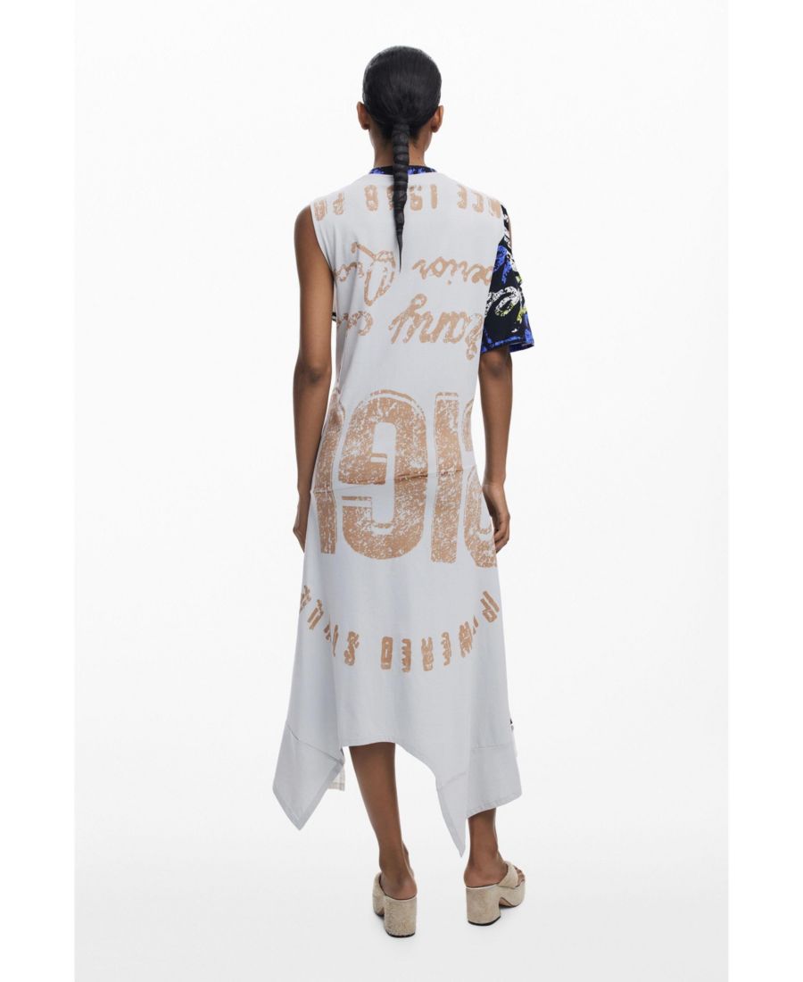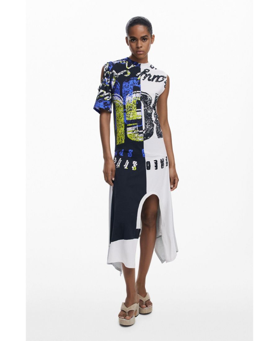 Платье асимметричного кроя разной длины с принтом в виде надписей и вырезами.