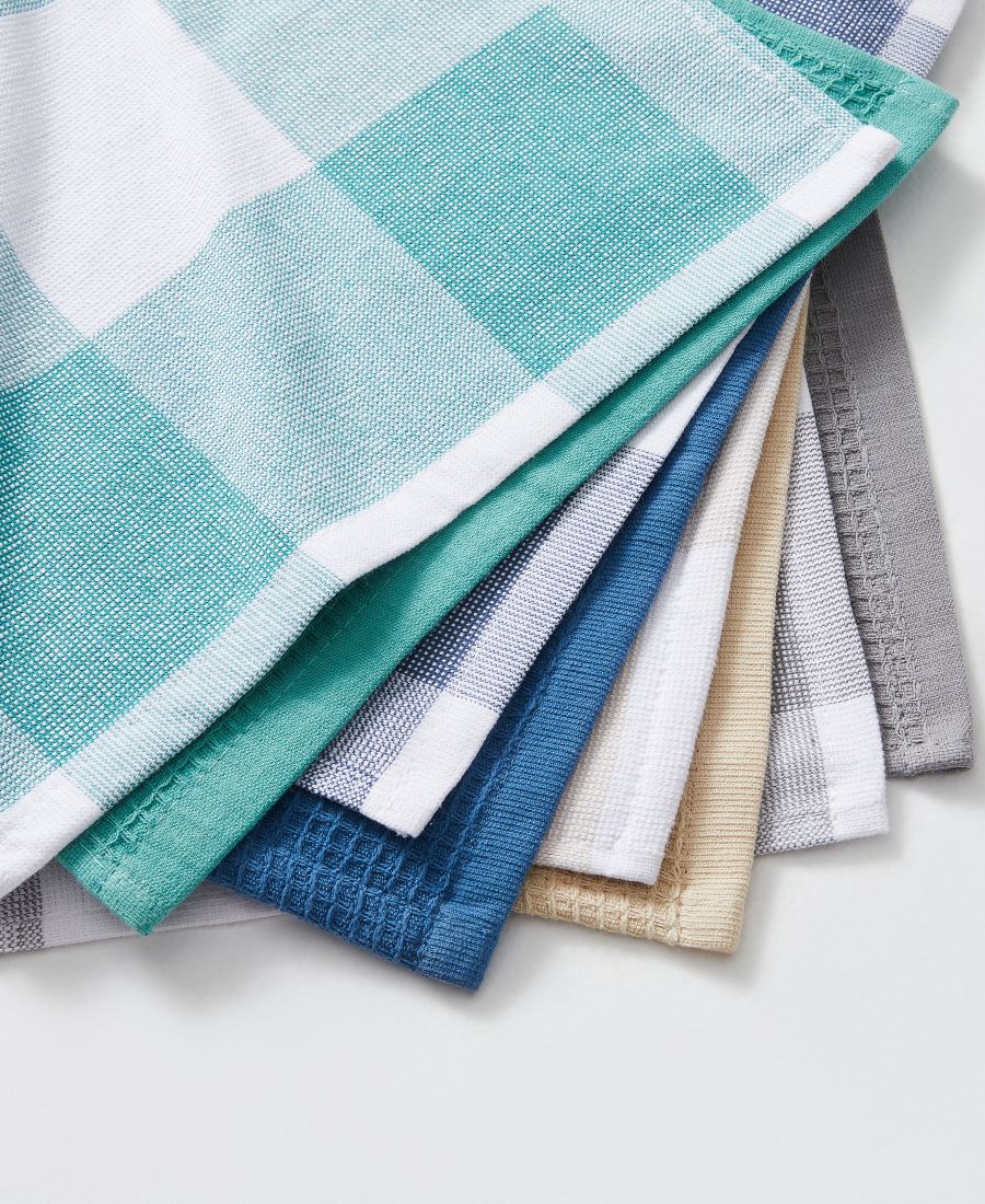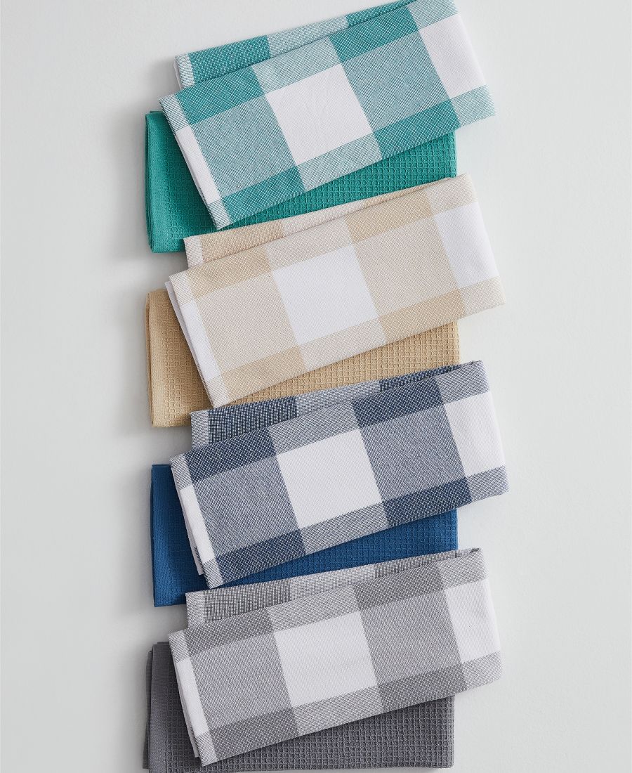 Размеры каждого изделия: 66 см в длину x 40 см в ширину. Вес каждого изделия: 480 г. В комплект входят: 2 кухонных полотенца в клетку, окрашенные пряжей, и 2 однотонных кухонных полотенца с вафельной текстурой. Впитывающие. Прочные. 100% хлопок. Машинная стирка. Импортные.