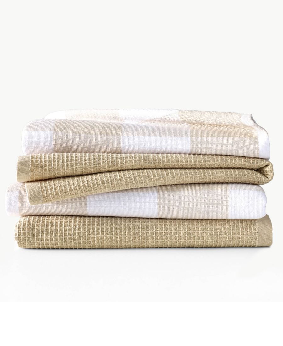Размеры каждого изделия: 66 см в длину x 40 см в ширину. Вес каждого изделия: 480 г. В комплект входят: 2 кухонных полотенца в клетку, окрашенные пряжей, и 2 однотонных кухонных полотенца с вафельной текстурой. Впитывающие. Прочные. 100% хлопок. Машинная стирка. Импортные.