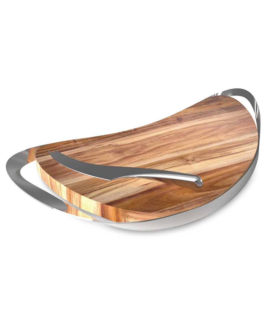 На сырной доске Nambé Pulse выразительная текстура древесины обрамлена изящной полосой полированной нержавеющей стали, а в комплекте с ней идет стильный изогнутый нож для сыра.