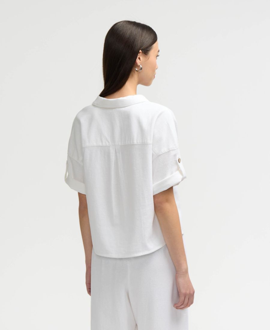 Добавьте в свой гардероб непринужденного шарма с помощью этой укороченной рубашки на пуговицах. Изготовленная из легкого материала, она имеет привлекательный V-образный вырез, классический воротник и застежку на пуговицах спереди для удобства создания образов. Нагрудный накладной карман добавляет практичности, а короткие рукава с пуговицами и укороченный силуэт создают одновременно расслабленный и изысканный образ.