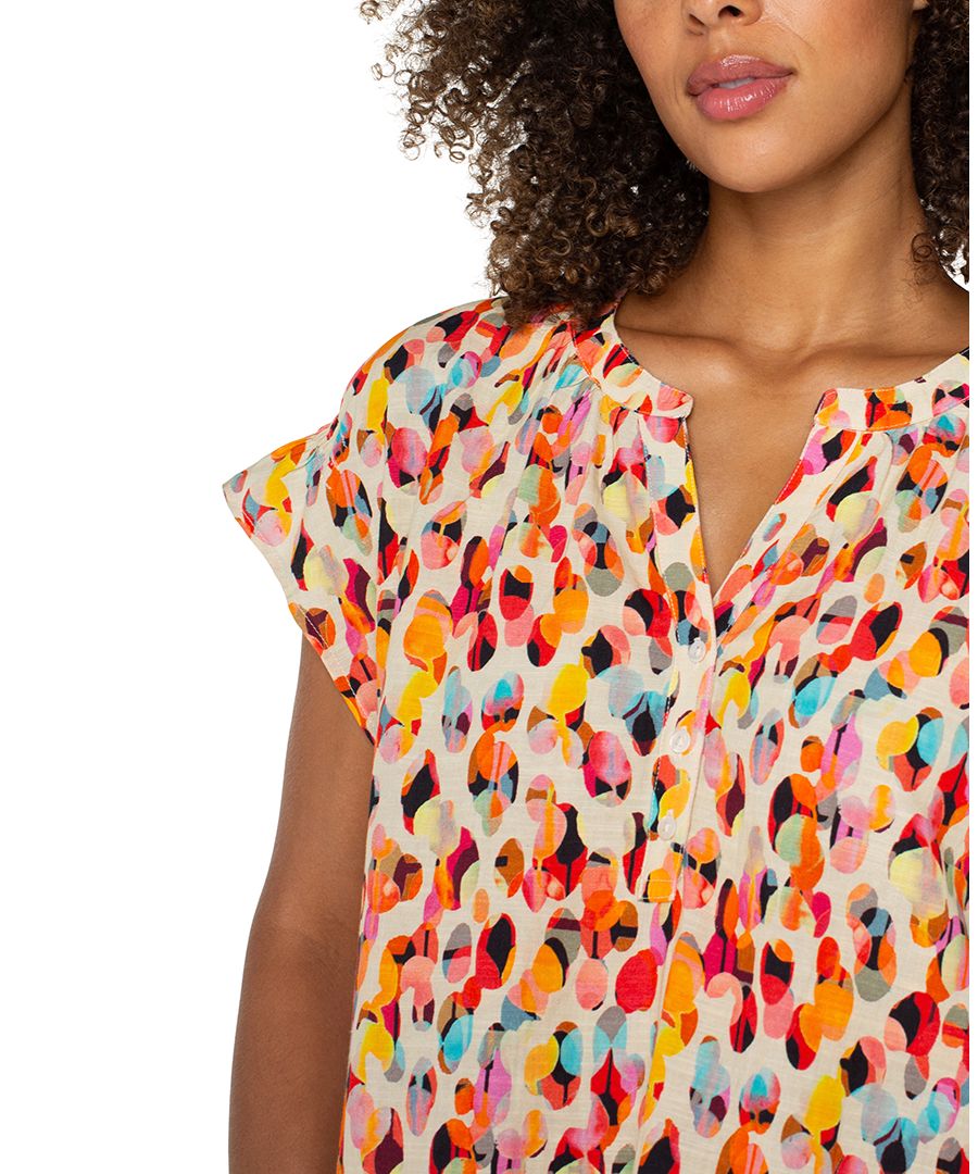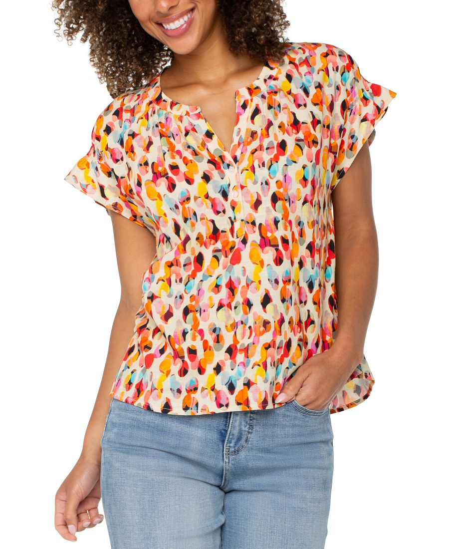 Этот небольшой топ-рубашка от Liverpool Los Angeles с разноцветным точечным принтом придает ему игривый вид. Завершают образ рюши на манжетах.