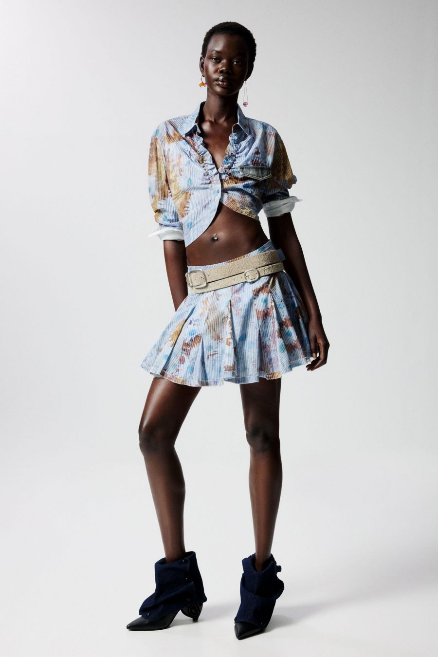 Рубашка прямого кроя с длинными рукавами, изготовленная из хлопчатобумажной ткани, с принтом в полоску и цветочные мотивы.