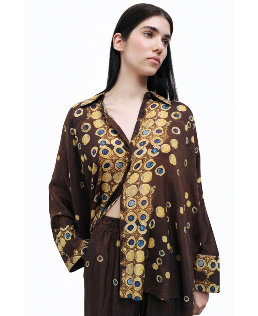 Эта элегантная рубашка с принтом имеет застежку на пуговицы спереди, традиционный воротник, длинные рукава с разрезами и изящный, утонченный дизайн.