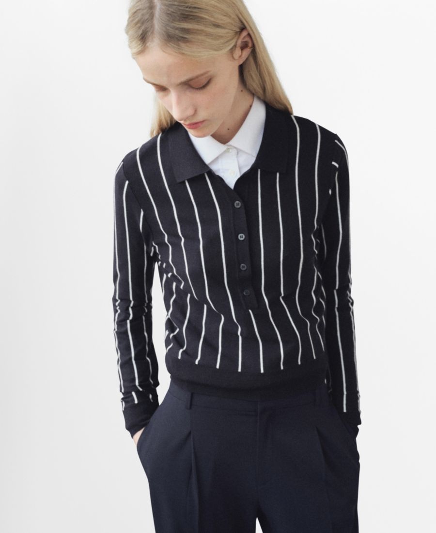 Яркий узор на полосатом свитере с высоким воротником от Mango - универсальный вариант для многослойной одежды. Изготовленный из смесовой шерстяной ткани, этот полосатый свитер имеет прямой крой, высокий воротник-поло с застежкой на пуговицы и длинные рукава.