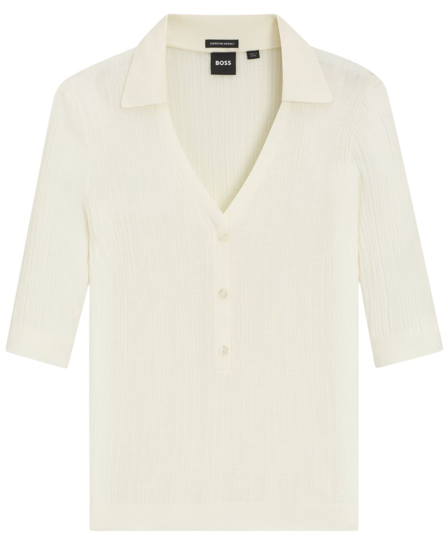 Этот женский свитер BOSS, связанный из тончайшей натуральной шерсти, имеет застежку на пуговицах и воротник, что придает ему вневременной стиль. Комбинированная структура, V-образный вырез и короткие рукава.