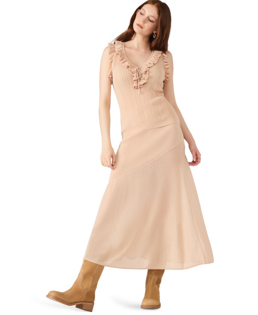 Этот стильный и кокетливый свитер без рукавов от Steve Madden имеет завязки спереди, что обеспечивает удобство ношения и возможность регулировки стиля. Оборки добавляют движения и нотку изысканности.