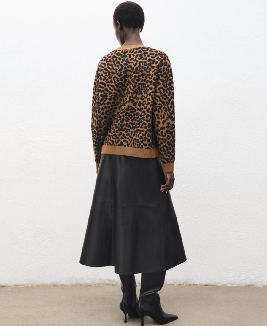 Вязаный свитер с леопардовым принтом от Mango отличается узорчатой вязкой. Изготовленный из тонкой трикотажной ткани, этот свитер имеет прямой крой, круглый вырез горловины и длинные рукава.