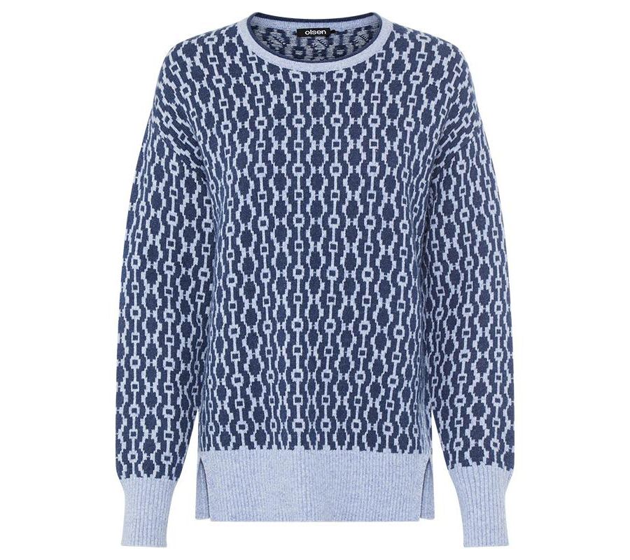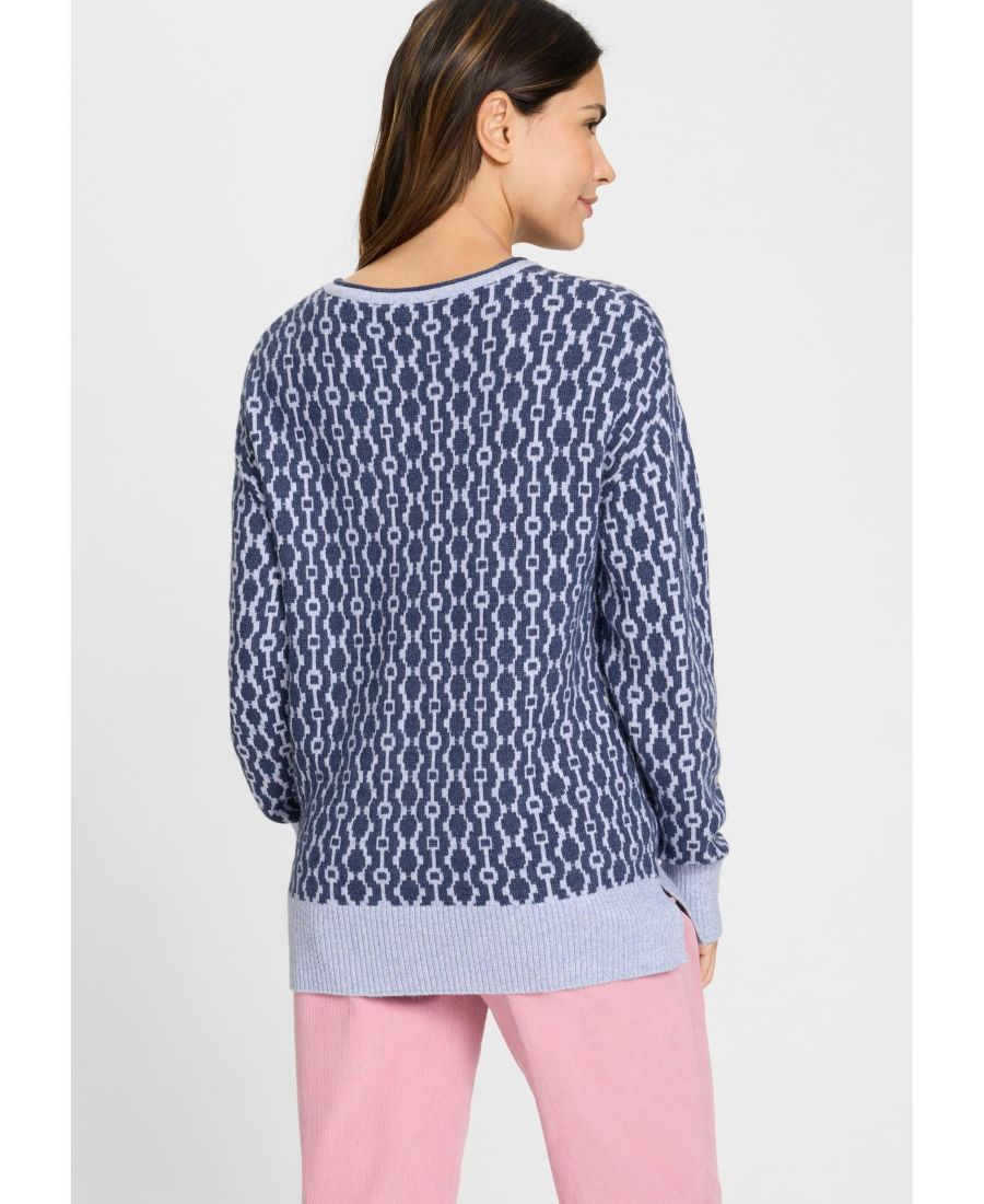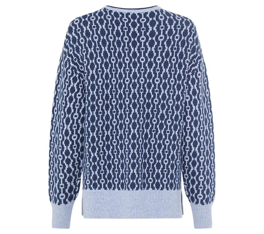 На этом невероятно мягком свитере в прекрасных синих оттенках ярко выделяется сплошной ретро-узор, напоминающий замочные скважины.