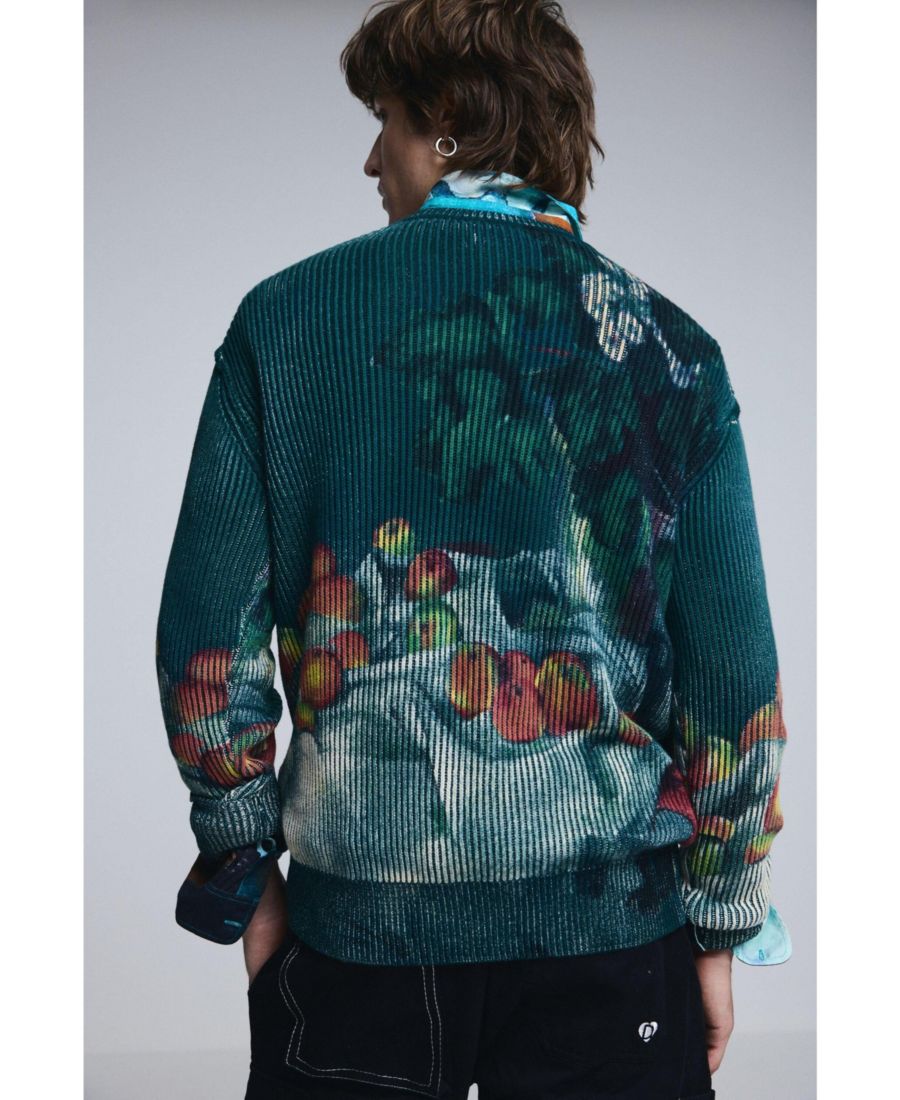 Плотный свитер с круглым вырезом и фактурной тканью с принтом в стиле импрессионизма, напоминающим натюрморт.