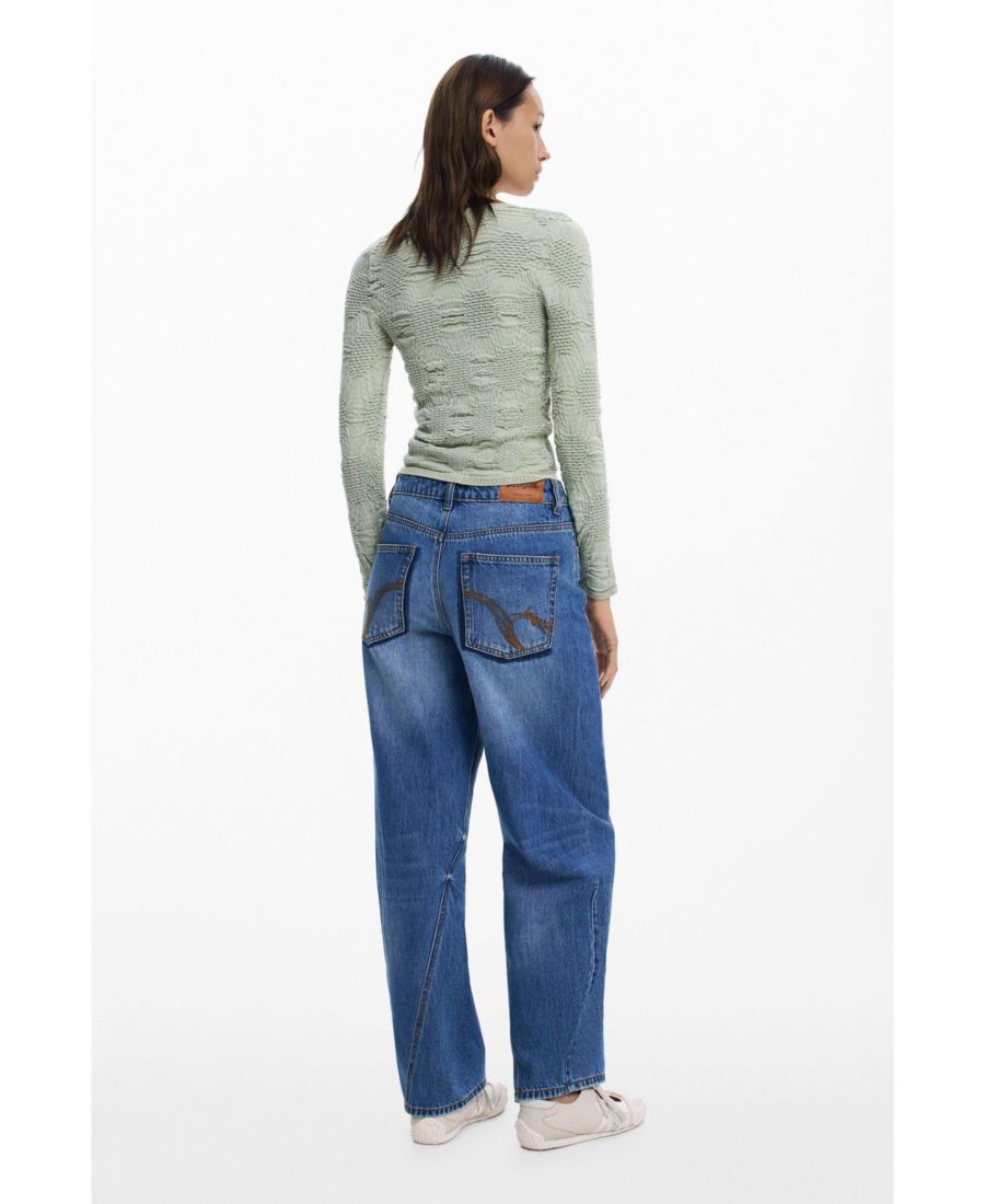 Легкий свитер с длинными рукавами, круглым вырезом и рельефным принтом в виде солнца в той же цветовой гамме.
