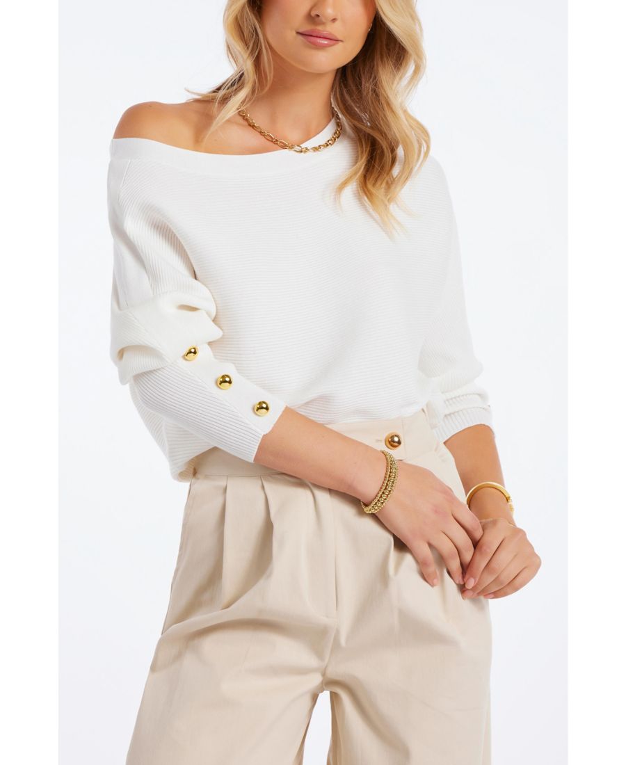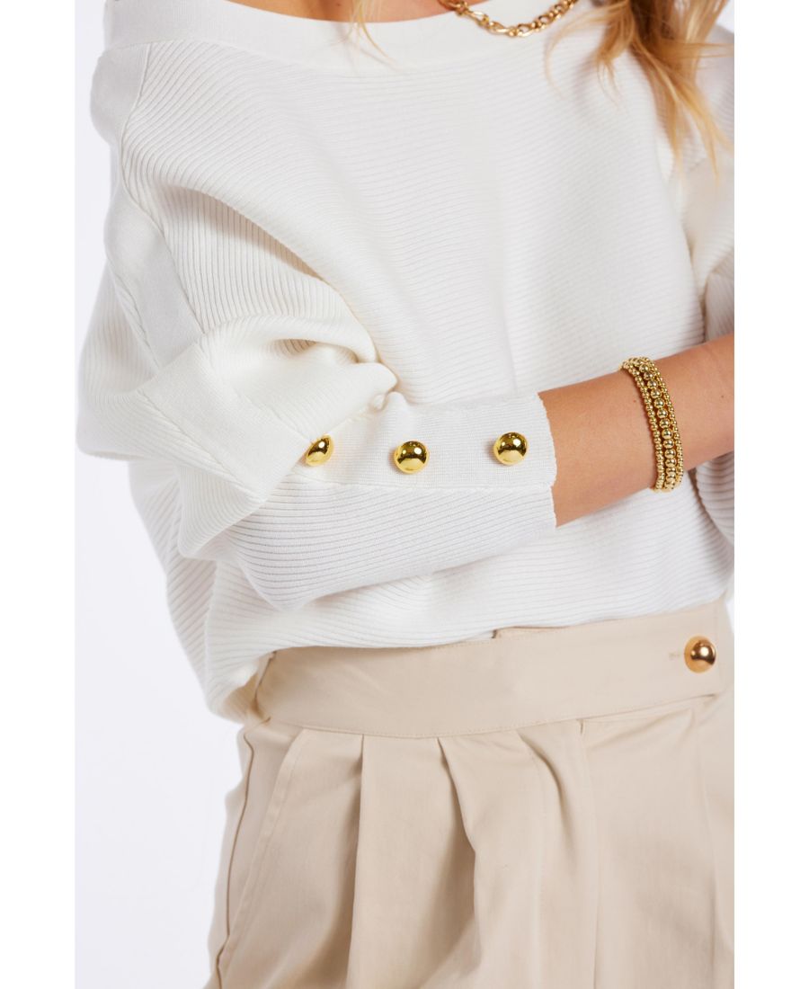 Вязаный свитер в рубчик с вырезом-лодочкой и золотыми пуговицами на рукавах.