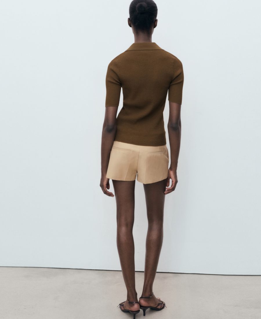 Изящная вязка легла в основу ребристого свитера с воротником-поло от Mango.