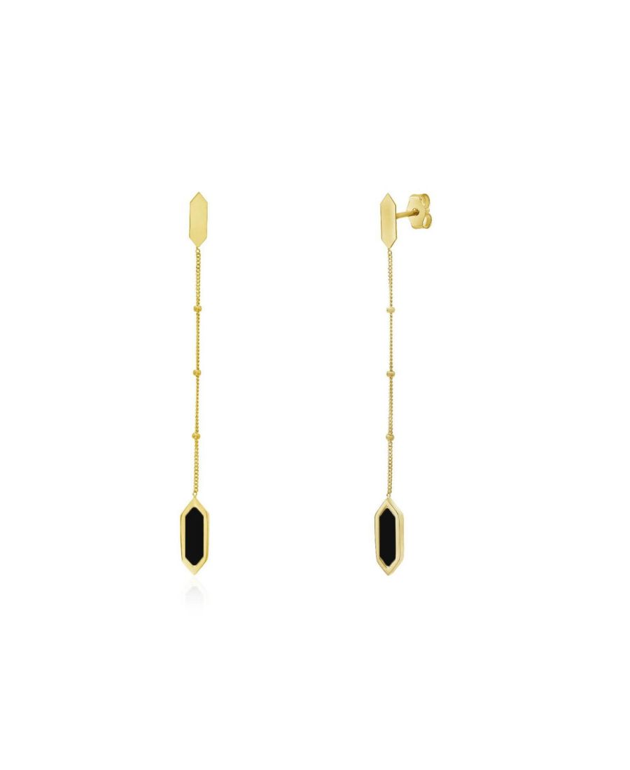 Серьги Lovery Onyx Hexagon Bead Drop Earrings выполнены из 14-каратного желтого золота. Размеры каждого шестиугольника: 11 x 4 миллиметра, 0,43 x 0,15 дюйма. Длина каждой серьги: 55 миллиметров - 2,16 дюйма.