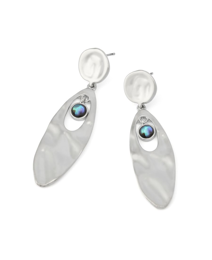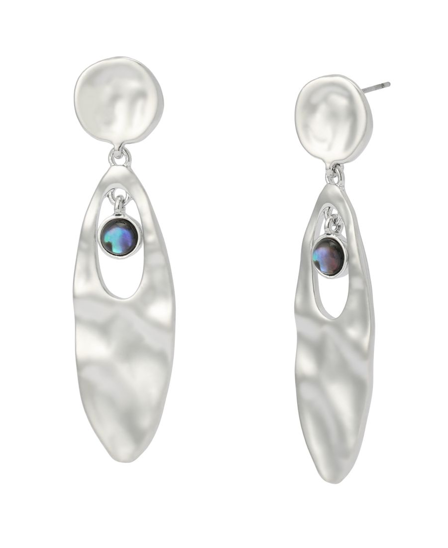 Изысканные серьги-подвески с круглым диском-гвоздиком в сочетании с овальным скульптурным кабошоном из тонкого перламутра. Украшены слегка кованой текстурой, идеально подходящей для повседневного образа.