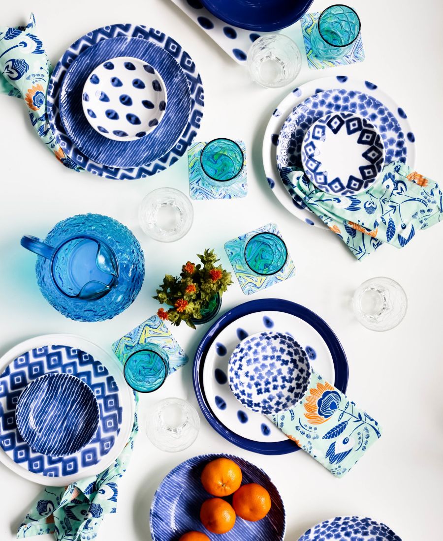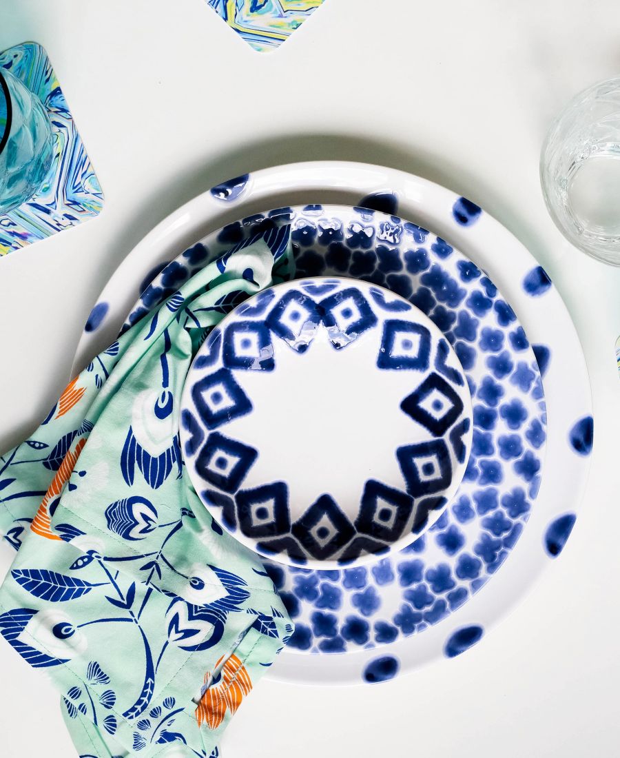 Воссоздайте прекрасную мозаичную плитку, которую можно найти на греческих островах, с помощью салатницы Санторини, расписанной на твердой керамике забавным сине-белым узором.