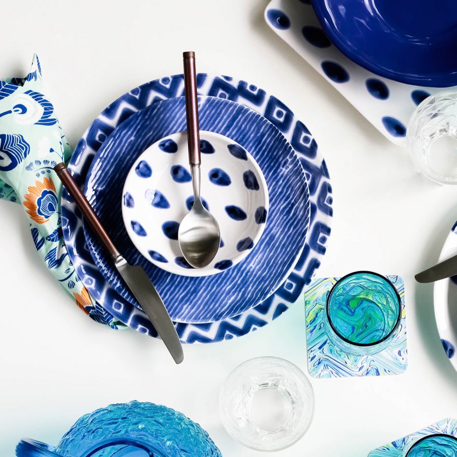 Воссоздайте прекрасную мозаичную плитку, которую можно найти на греческих островах, с помощью салатницы Санторини, расписанной на твердой керамике забавным сине-белым узором.