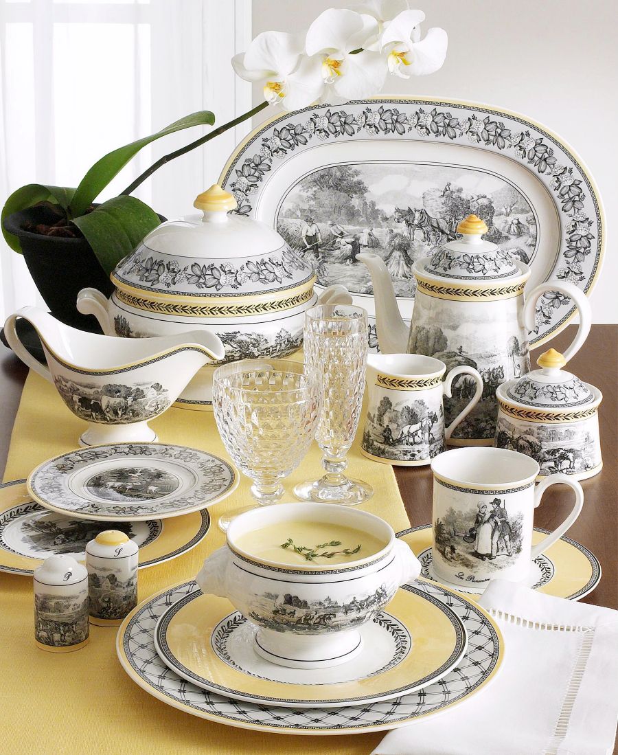 Комбинируйте и сочетайте, выбирая из четырех вариантов черно-белых французских сельских пейзажей и узоров на белом фарфоре с желтой каймой.