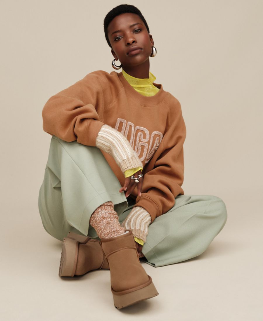 Приготовьтесь ощутить сочетание стиля и комфорта с этой толстовкой UGG, выполненной с рукавами реглан для свободы движений. Знаменитый графический шрифт выполнен из фактурной синели, что придает ей игривый и элегантный вид. Ребристый воротник, манжеты и нижний край обеспечивают структурированность, сохраняя при этом ощущение уюта.