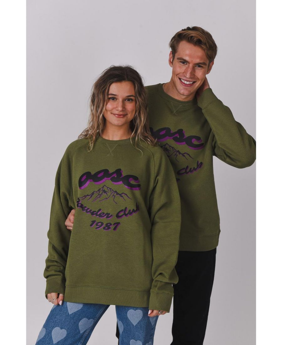 Толстовка OOSC изготовлена из роскошной мягкой на ощупь смеси органического хлопка и полиэстера средней плотности, соответствует стандартному размеру. На передней части изображен принт Powder Club 1987. Воротник и плечи имеют рукава реглан. Рост модели 183 см, размер Medium.