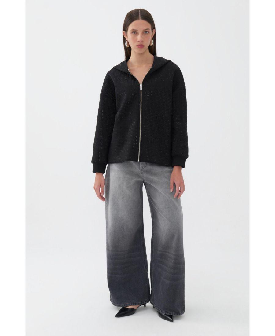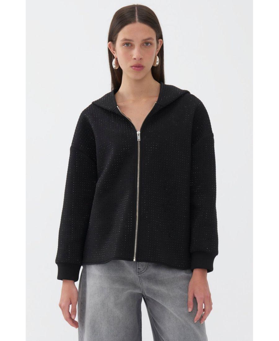 Она имеет стандартный крой, облегающий силуэт, без подкладки, трикотажную ткань, длинные рукава с манжетами, декоративную металлическую молнию с камнем спереди и не имеет карманов.