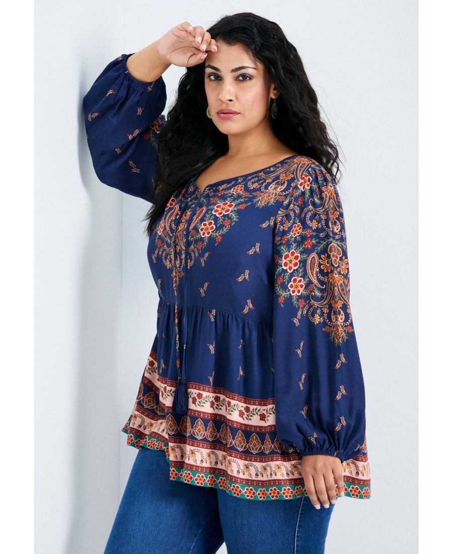 Представляем тунику Kiani, в которой богемный шарм сочетается с повседневной элегантностью. Игривая V-образная форма с завязками и бахромой делает эту тунику незаменимой в вашем гардеробе. Изготовленная из роскошной вискозной саржи и имеющая длинные рукава, она легко драпируется, создавая привлекательный силуэт. Принт по краю добавляет нотку художественного стиля, делая ее идеальной для тех, кто любит уверенно и изящно выражать свою женственность. МАТЕРИАЛ: 100% вискоза. УХОД: Машинная стирка. Импортный товар. Основные характеристики: Длина: 76 см. Размеры: 14-32. Блузка в крестьянском стиле с принтом. Длинные рукава-блузон.