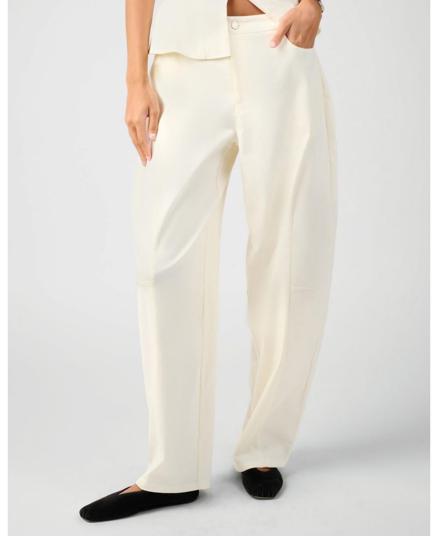 Эти брюки от костюма, сшитые по фигуре со средней посадкой на талии, имеют застежку-молнию с пуговицей на ножке, четыре функциональных кармана и объемные штанины-баллоны, подчеркнутые скульптурными боковыми швами.