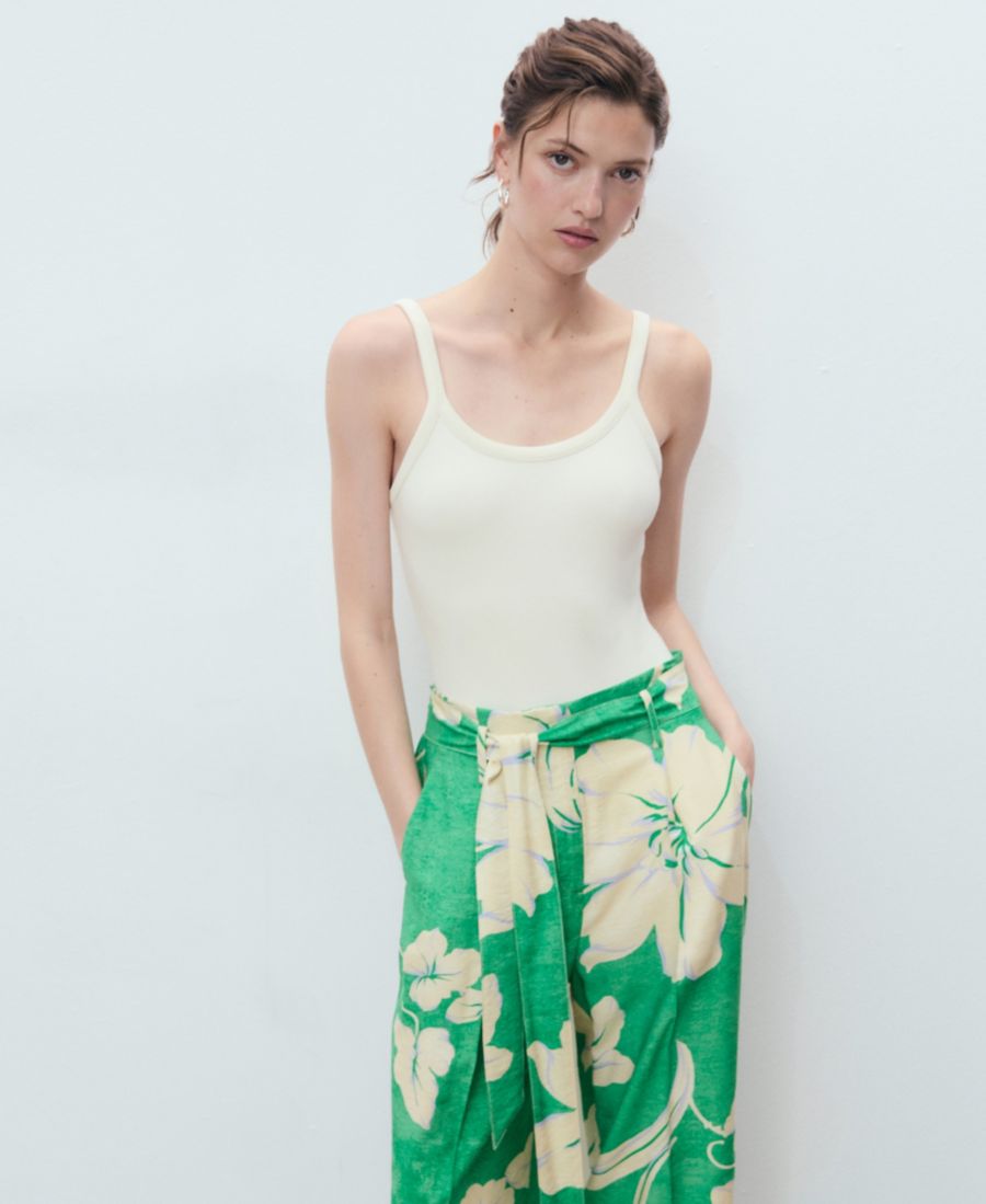 Узор в движении украшает брюки с ремнем от Mango. Эти брюки прямого и укороченного кроя украшены цветочным принтом, имеют эластичный пояс, съемный ремень, петли для ремня и внутреннюю подкладку.