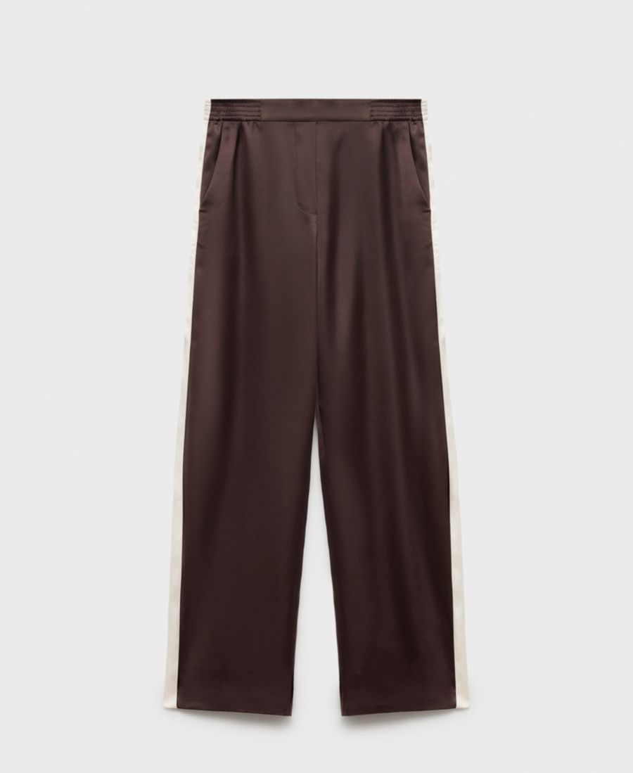 Добавьте блеска с помощью атласных брюк с контрастной полосой от Mango. Эти брюки со средней посадкой, изготовленные из атласной ткани, имеют длинный прямой крой.