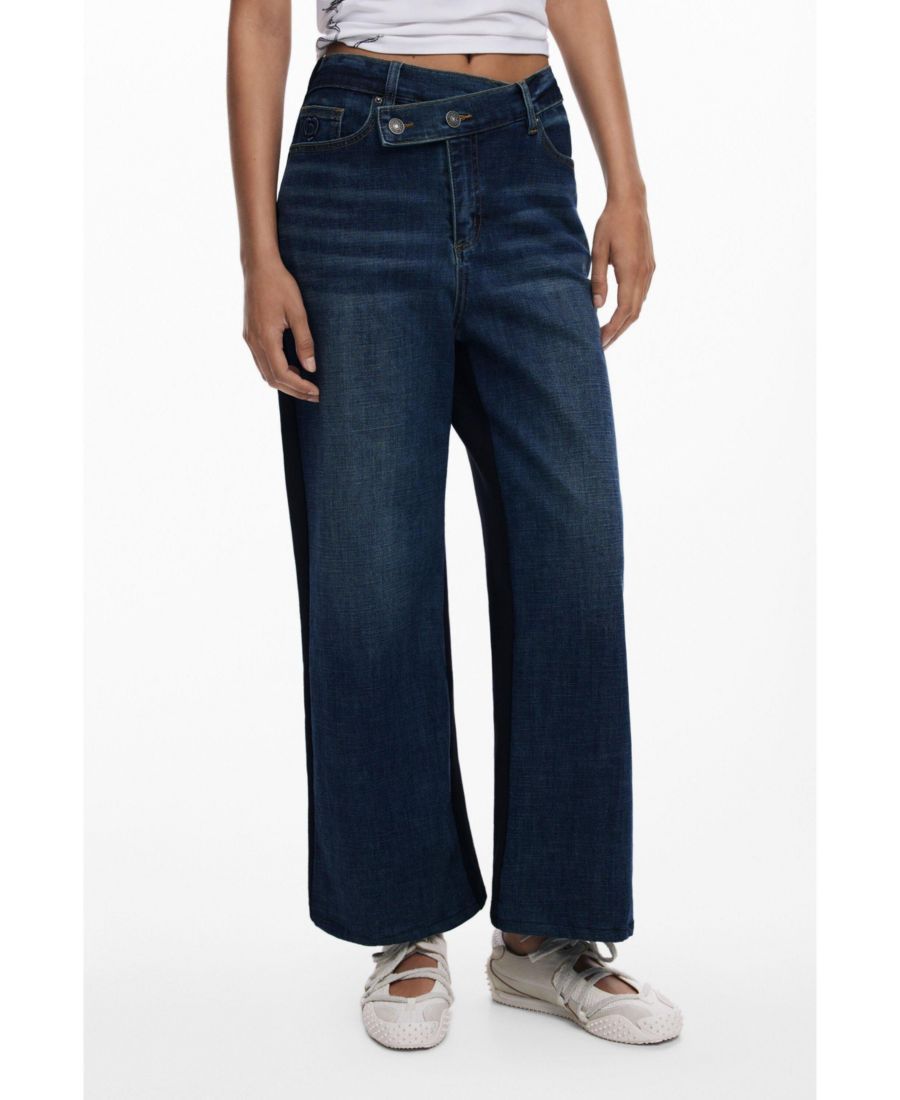 Длинные джинсовые брюки с эффектом потертости, выполненные из трикотажной ткани сзади и имеющие асимметричный пояс.