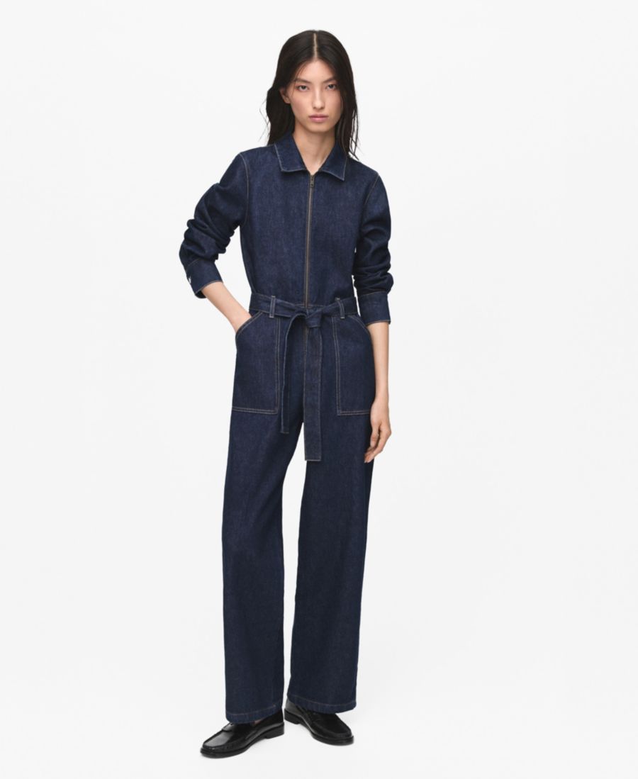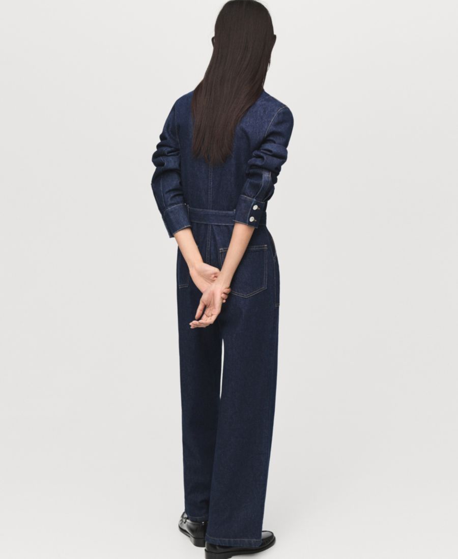 Комбинезон Belt Denim от Mango отличается структурированной легкостью и непринужденностью. Этот длинный комбинезон, изготовленный из хлопчатобумажной ткани, имитирующей деним, имеет прямой крой, воротник рубашечного типа, длинные рукава с манжетами на пуговицах, шлевки для ремня, накладные карманы, пояс в тон и застежку-молнию спереди.