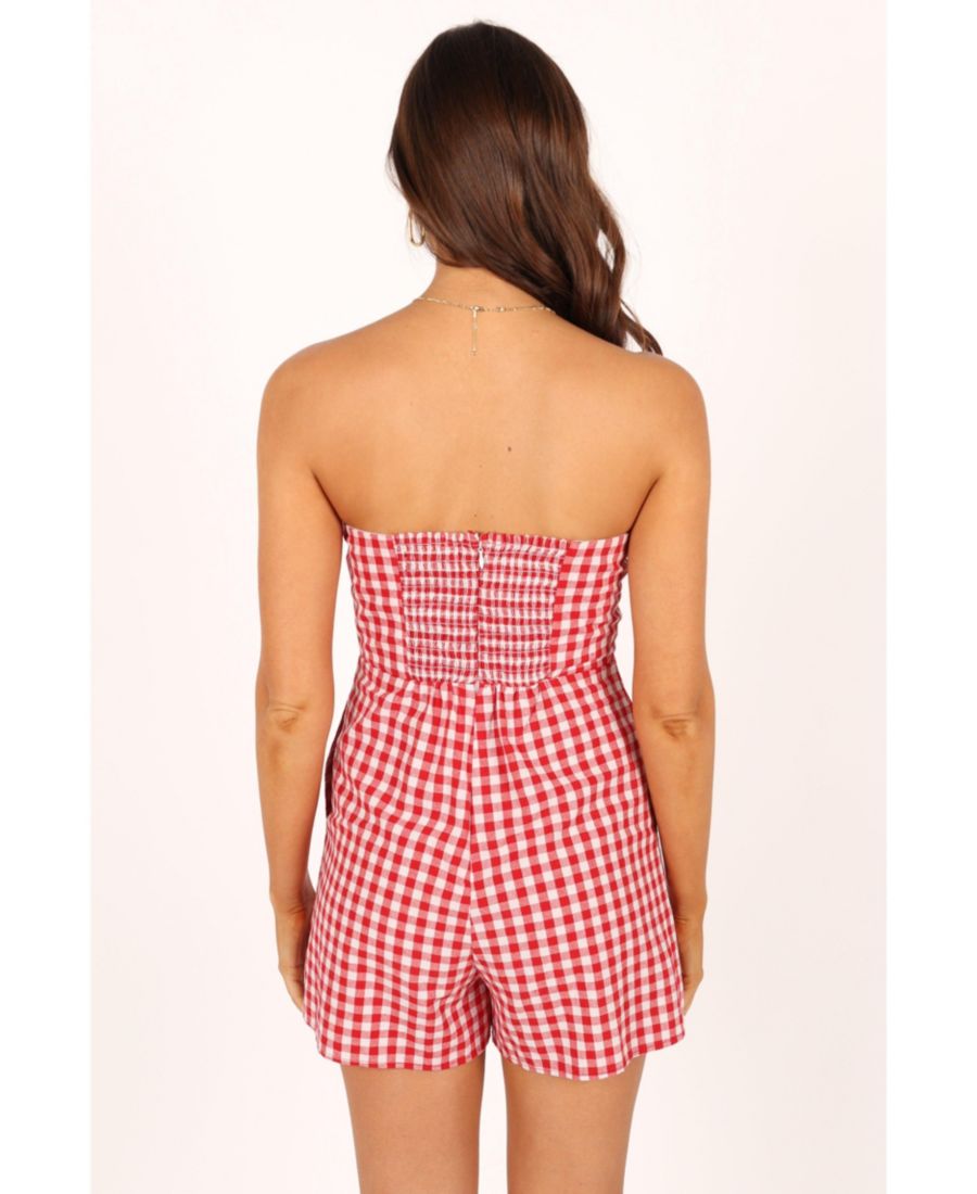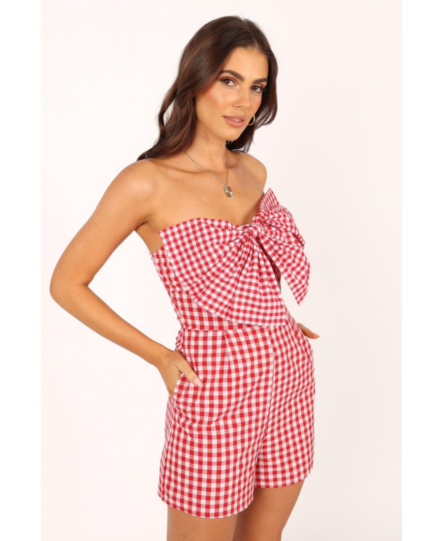 Если вы ищете игривый, женственный образ, который подойдет как для дневного, так и для вечернего выхода, этот комбинезон без бретелей - идеальный выбор! Украшенный очаровательным бантиком на груди и классическим красным клетчатым принтом, он непременно привлечет внимание, куда бы вы ни пошли.