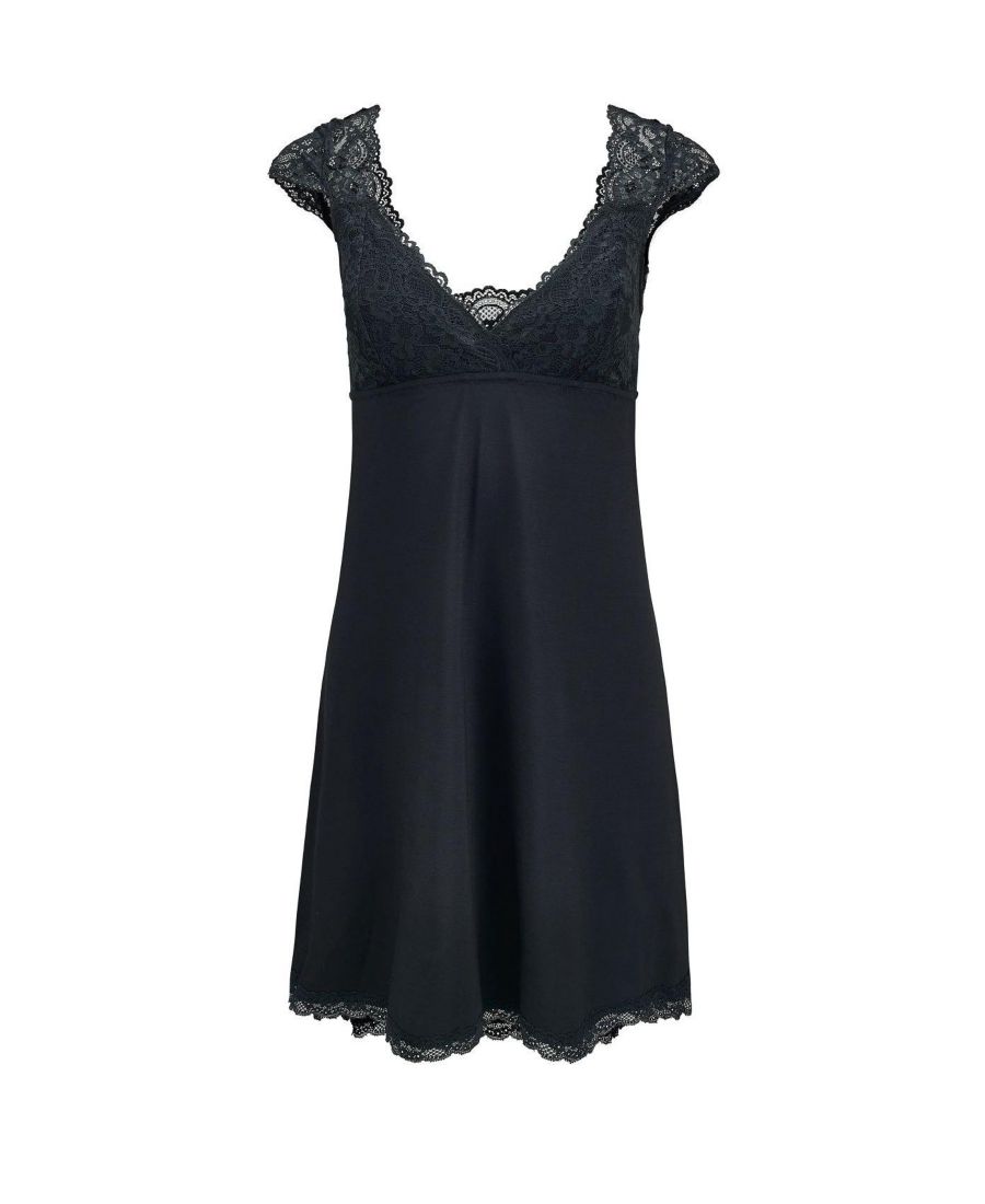 Эта красивая двухцветная комбинация имеет привлекательный крой и выполнена из мягкой трикотажной ткани с романтичным контрастным кружевом на чашечках и коротких рукавах.