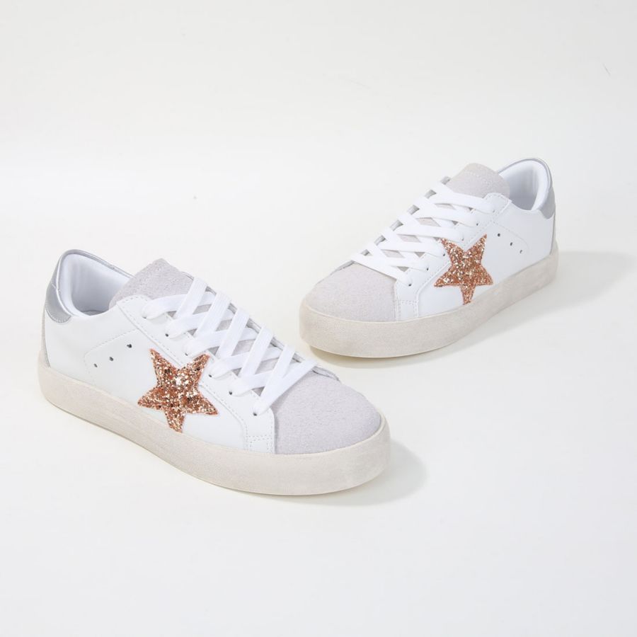 Низкие кроссовки Lillie02 украшены сверкающими звездами, контрастной замшевой текстурой и потертой подошвой, создавая непринужденно стильный образ с ярким блеском.
