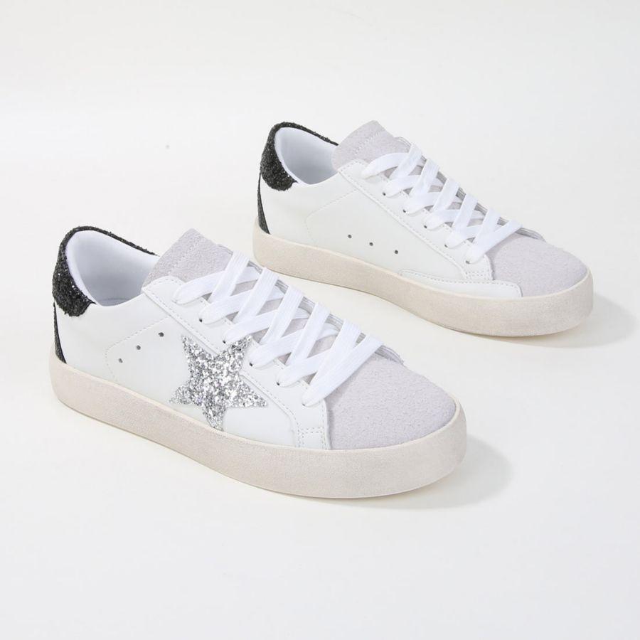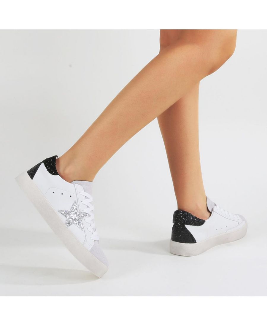 Низкие кроссовки Lillie02 украшены сверкающими звездами, контрастной замшевой текстурой и потертой подошвой, создавая непринужденно стильный образ с ярким блеском.