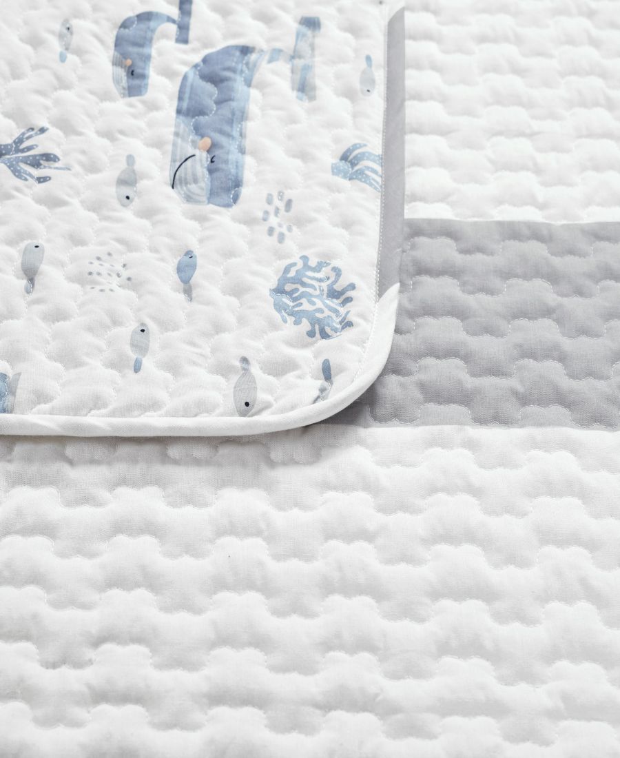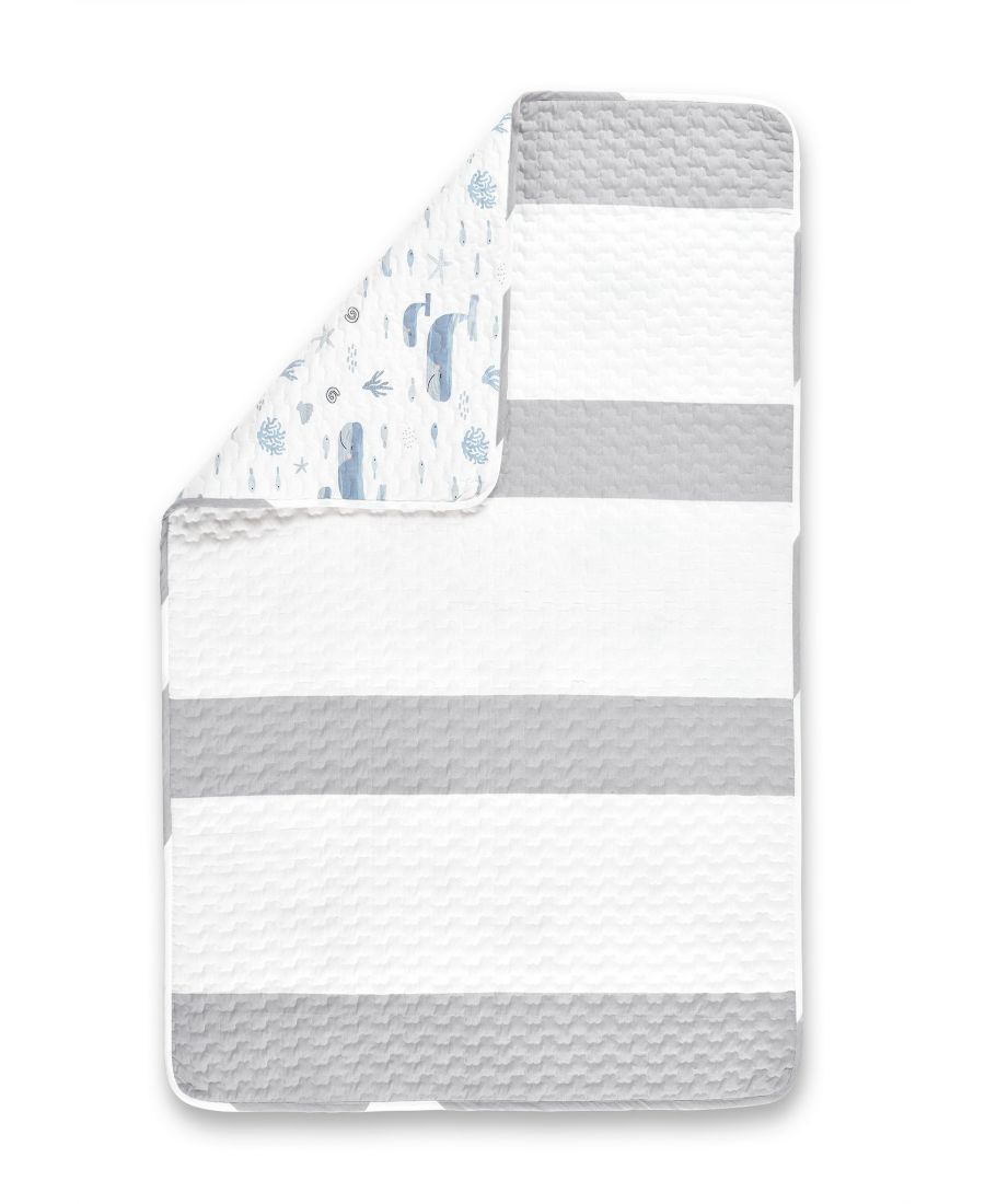Это двустороннее хлопковое детское одеяло имеет с лицевой стороны полосатый принт в морском стиле, а с обратной - узор с китами и другими морскими обитателями. Два прекрасных варианта дизайна по низкой цене.