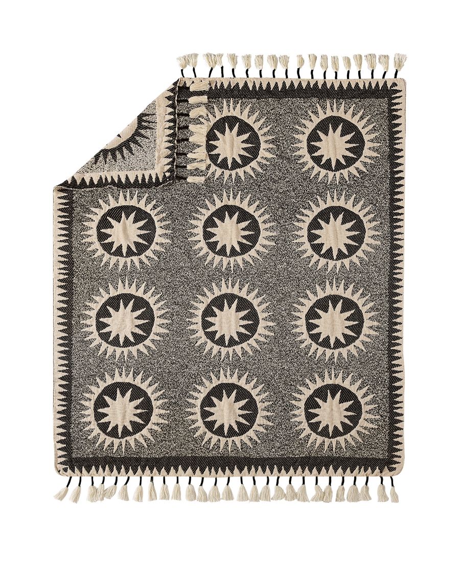Плед Soleil, разработанный Джастиной Блейкни, - это современная интерпретация традиционного стеганого одеяла сузани. Солнечные медальоны призваны излучать позитивную энергию. Черные точки в сочетании с солнцами символизируют бесконечность космоса.